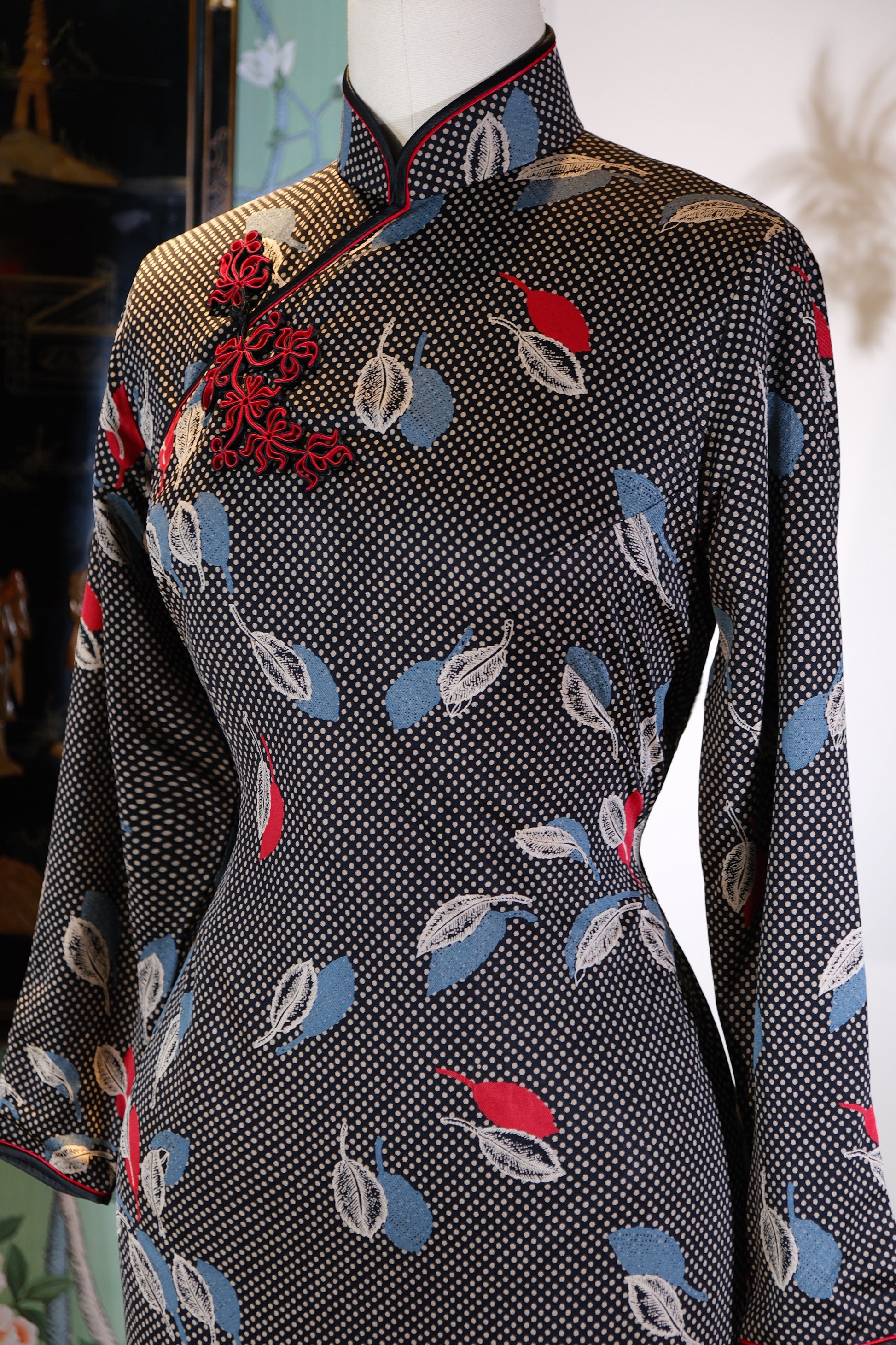 这件诞生于上世纪六十年代的香港古董旗袍,堪称东西方美学碰撞的活化石。它以深邃的黑色为底,缀满白色波点,如同夜空中的繁星,又似波普艺术大师罗伊·利希滕斯坦笔下跃动的漫画网点,将西方前卫艺术的视觉张力注入东方传统服饰的肌理。