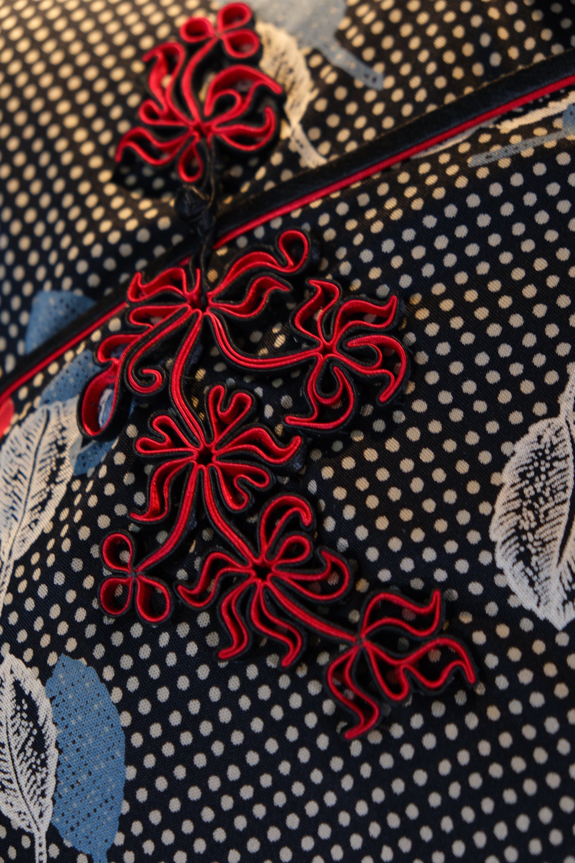 The red frog buttons at the lapel are shaped into floral forms using 3D embroidery techniques, with winding lines like calligraphic brushstrokes, creating a dialogue between "traditional craftsmanship" and "modern art" against the Pop Art patterns of the body. This collision was no accident, but a cultural consciousness of Hong Kong as the "Pearl of the Orient" during a specific historical period. As scholar Leo Ou-fan Lee remarked: "The modernity of Hong Kong is a unique flower that grew within the crevices between East and West."