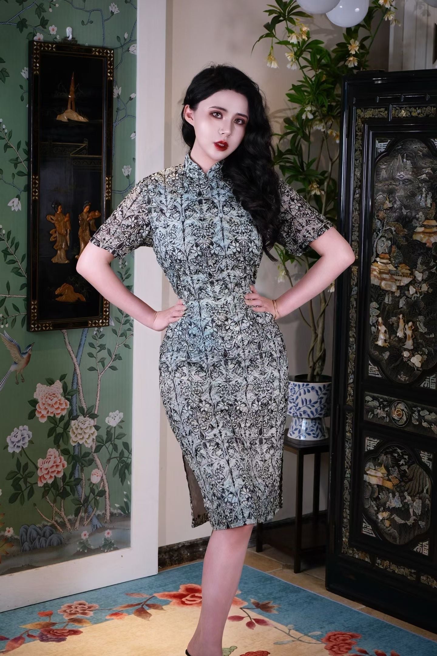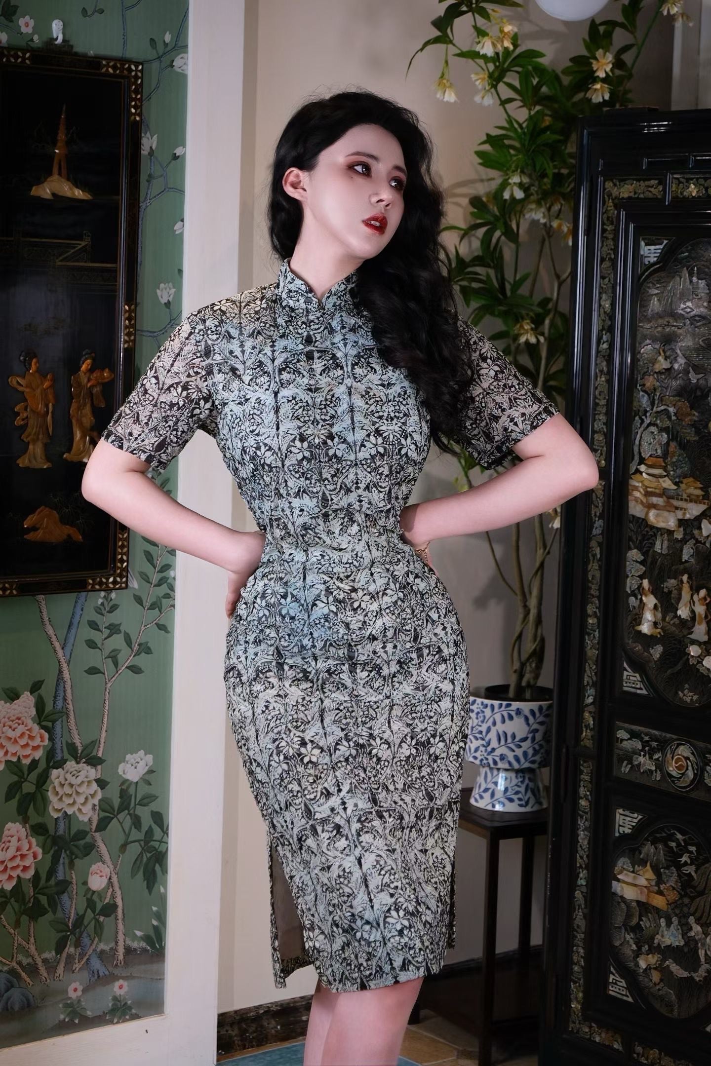 Despite the ancient allure of its patterns, the Qipao's tailoring is a masterpiece of 1950s modernism: sharp short sleeves, a knee-length hem, and an extremely cinched waistline all reflect the era's pursuit of physical freedom and confident charm. It flawlessly unites the reserved nature of Eastern women with the Western celebration of the female curve, making it the most story-rich and artistic choice for everyday wear. This sheer Qipao ensures that every turn of the body feels like a captivating moment from a vintage film.