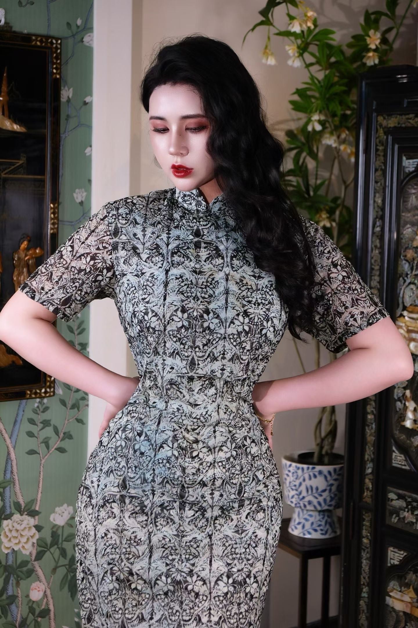 尽管花纹极具古老魅力,但旗袍的剪裁却是五十年代的摩登典范:利落的短袖、恰到膝盖的裙长以及极致收腰的轮廓,都体现了当时女性对解放身体和展现自信魅力的追求。它将东方女性的含蓄与西方对曲线的崇拜完美结合,是日常穿着中,最有故事感和艺术气息的选择。这件薄纱旗袍,让每一次的转身,都像是一部复古电影中,女主角的回眸。