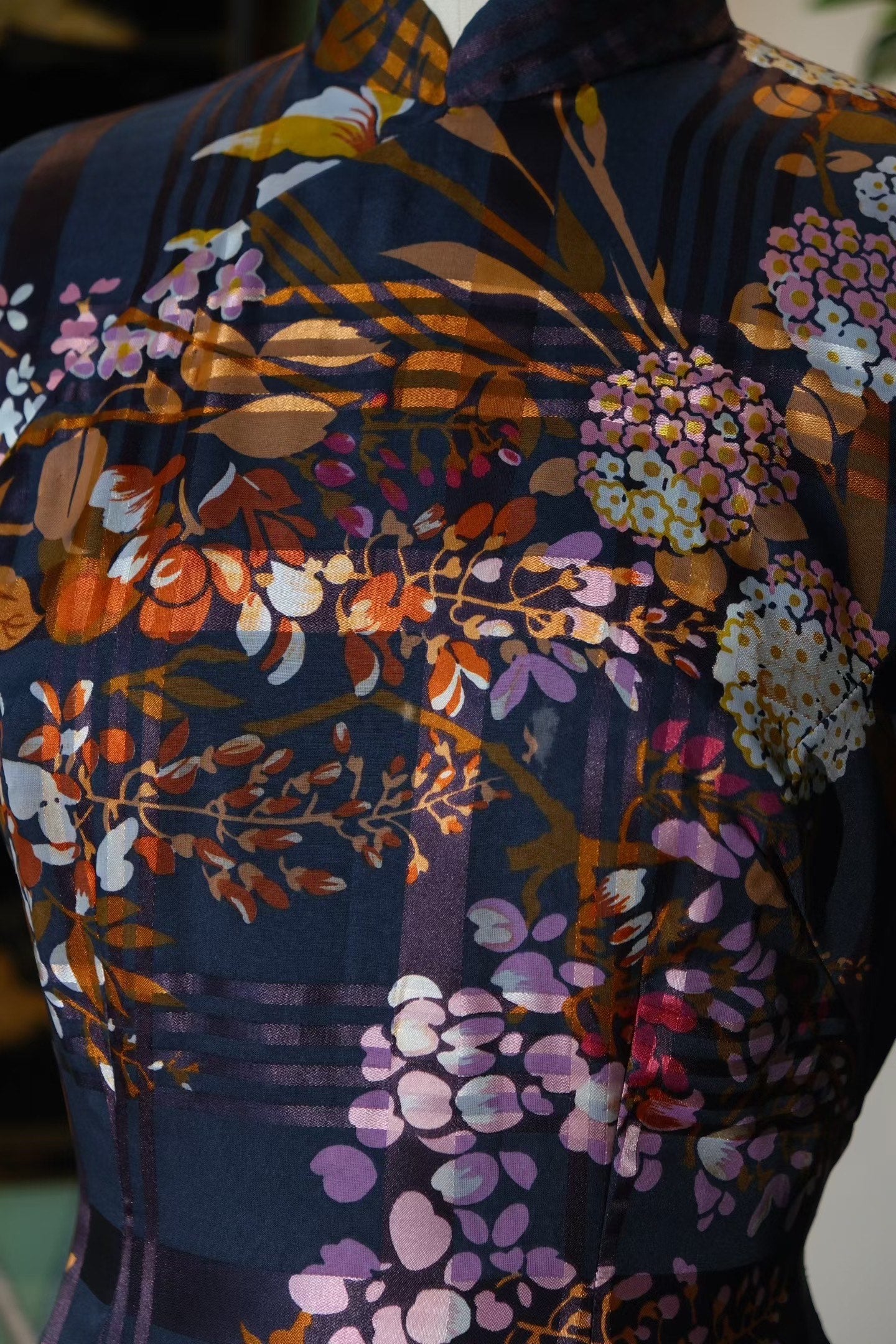 This Qipao perfectly captures the modern allure of 1960s Hong Kong style, artfully combining the lightness of sheer fabric with the seduction of dense florals. It embodies both Eastern reserve and the Western confidence in expressing the female silhouette. More than just a garment, it is a poem of the night, a secret of bygone glamour, and is highly collectible.