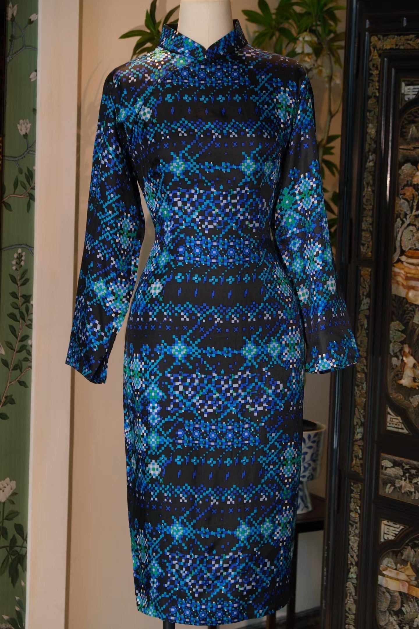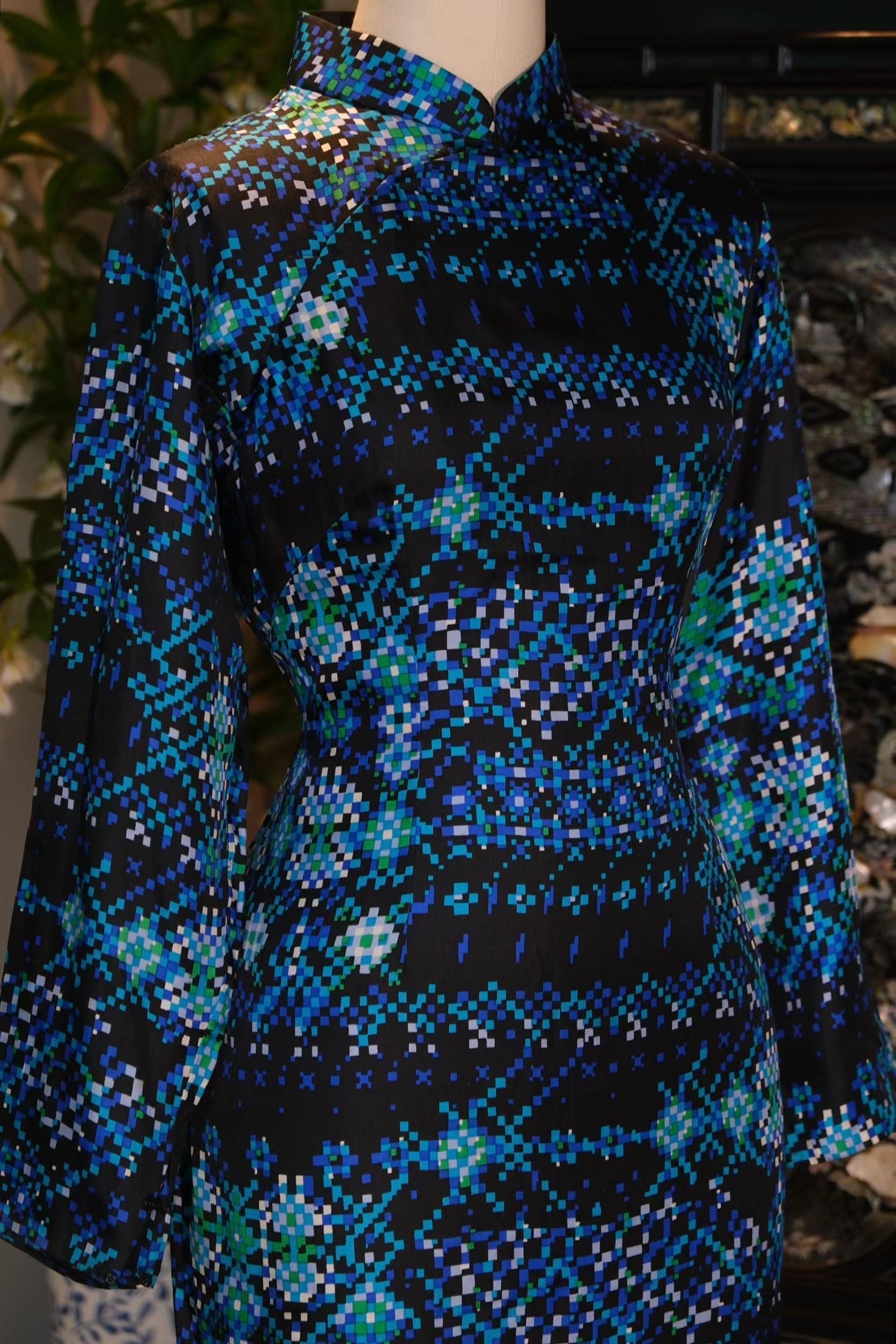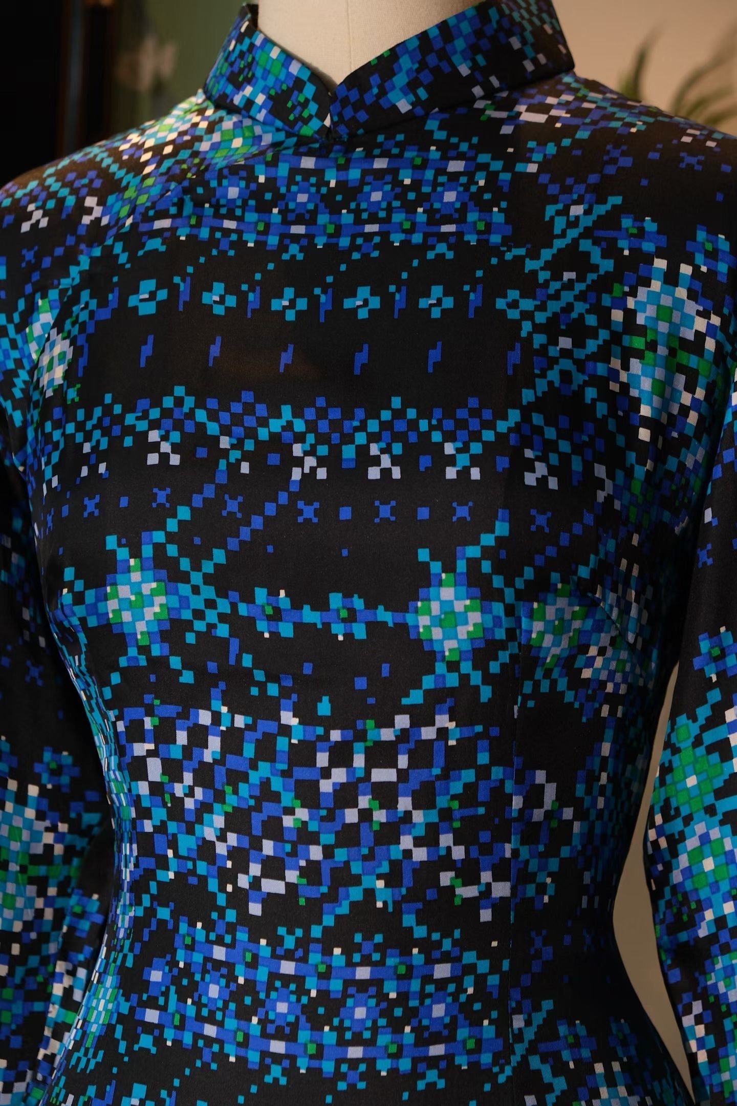 We share a highly rare 1960s vintage Qipao from Hong Kong that channels the aesthetic of "Cyber Luminance" and pixel art. Born in the 1960s, this garment uses a black ground as its backdrop to deconstruct traditional auspicious motifs into a "Pixel Magic Cube" of blue, green, and white, reconstructing Oriental aesthetics in a minute space.