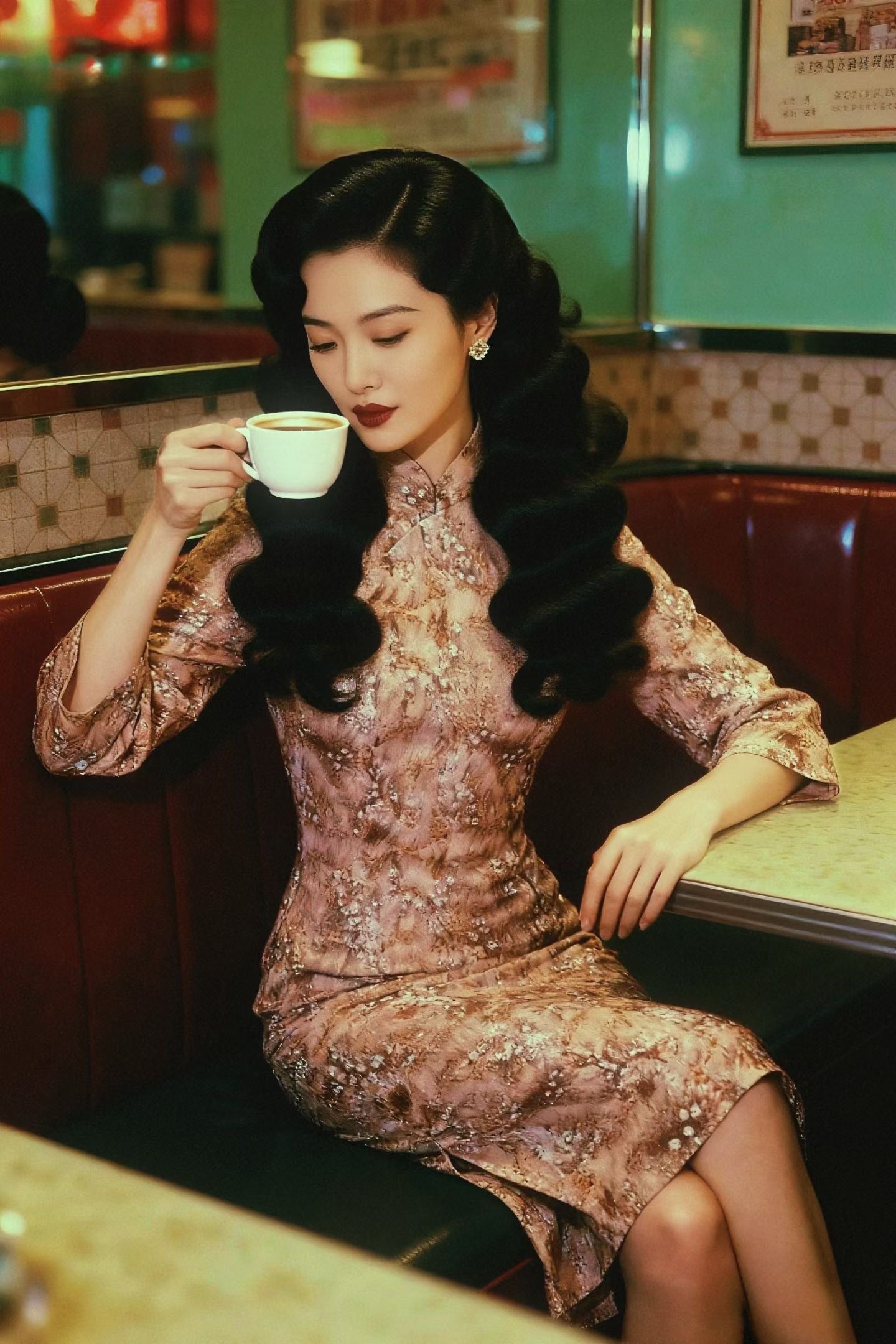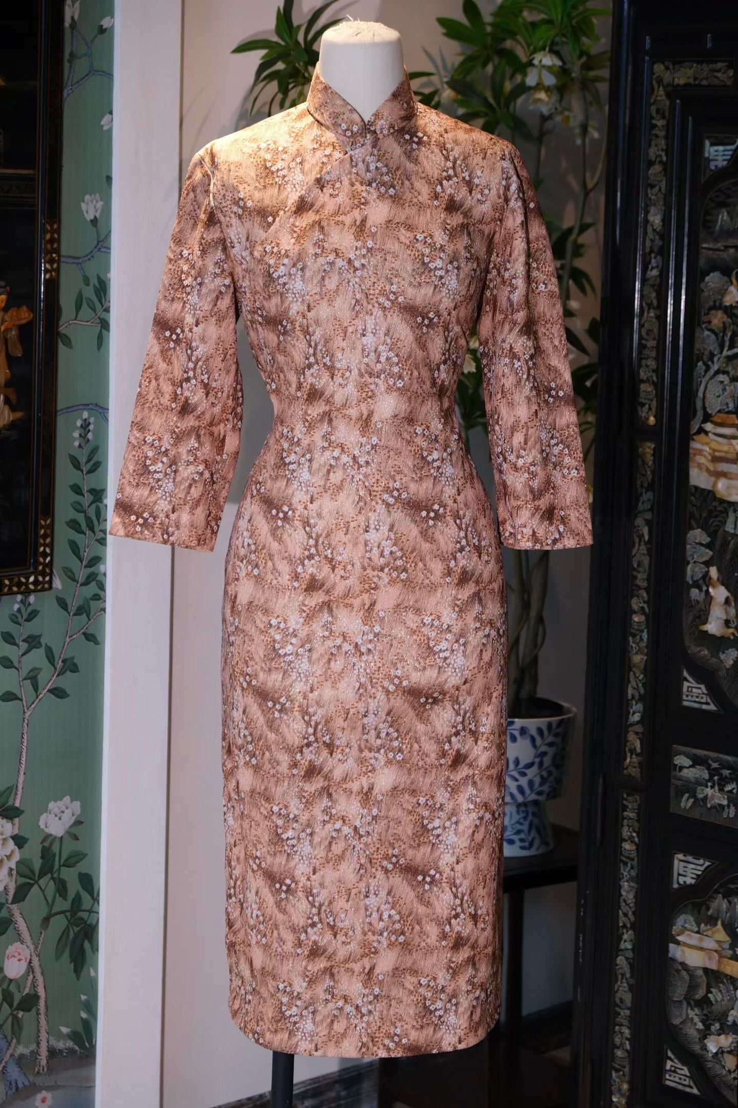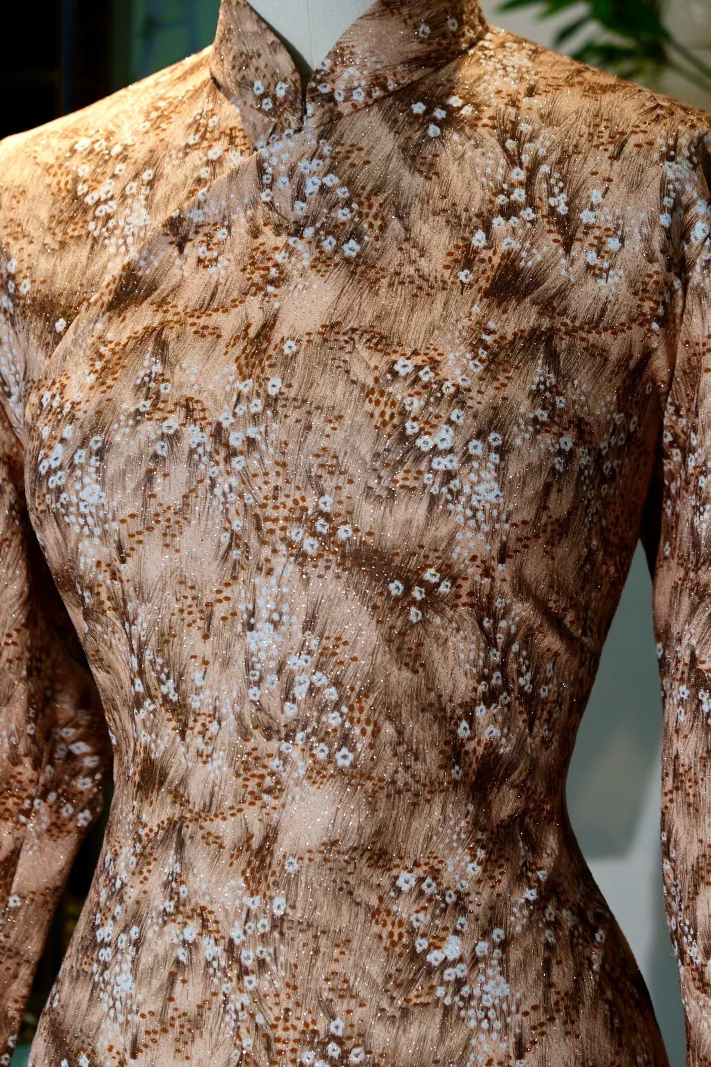 We are delighted to share a rare 1960s vintage Hong Kong Qipao featuring a lurex-woven, Maillard-tone abstract floral print. The colour palette of this Qipao captures the essence of the recently popularized "Maillard" aesthetic: the warm, brown base is calm yet gentle, echoing the rich hues of an autumnal afternoon coffee—sophisticated and refined.