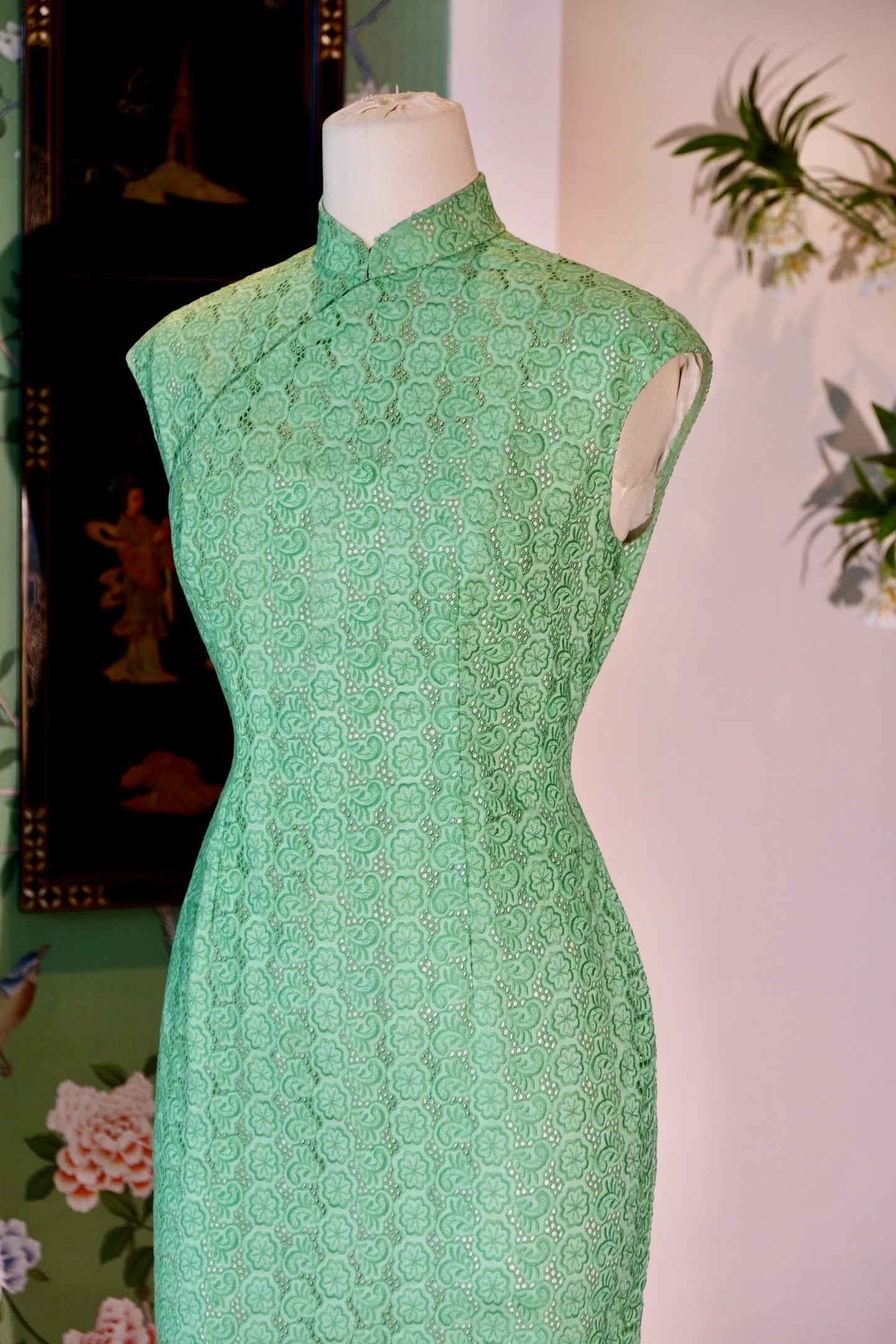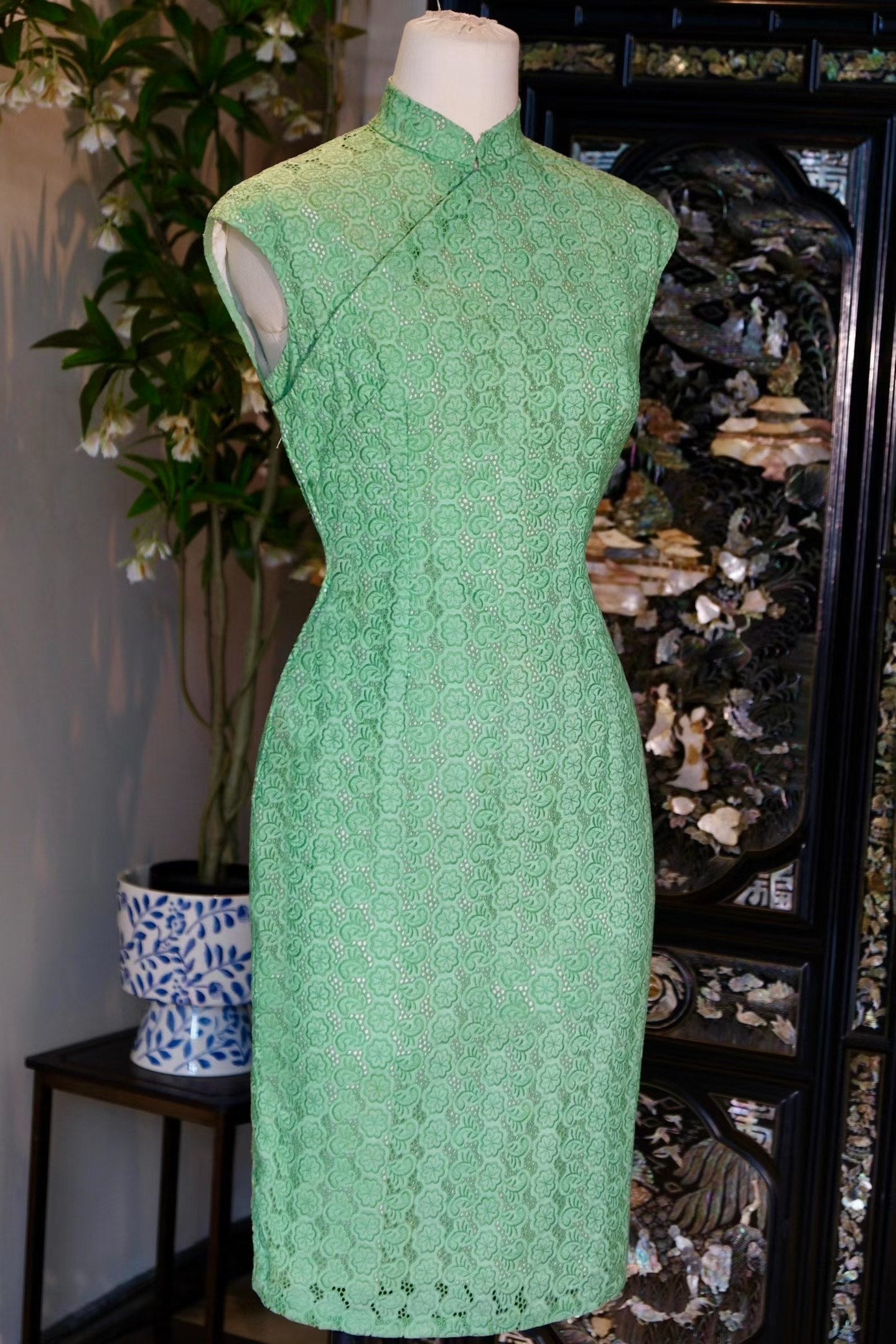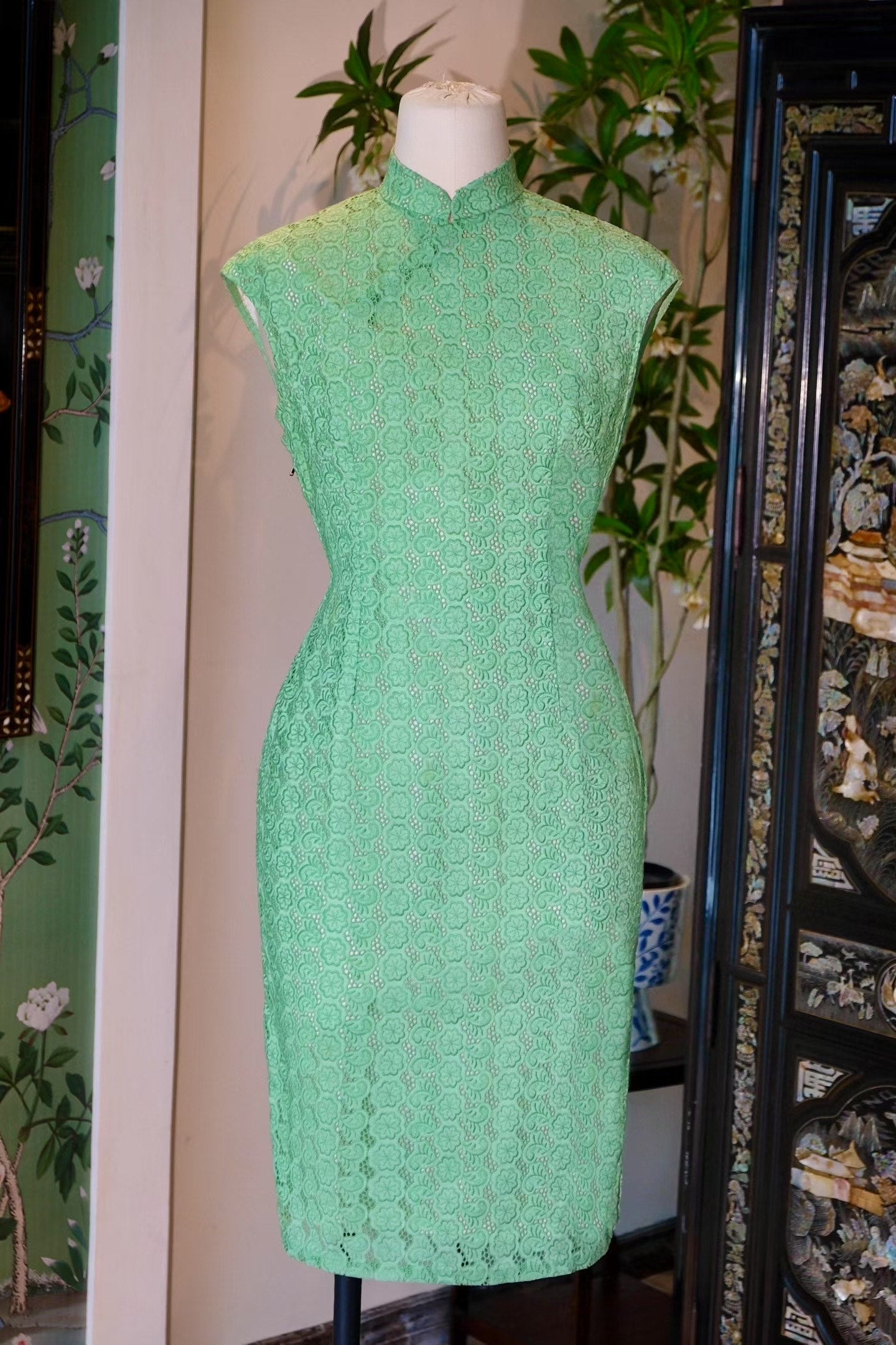 60年代 - 塞纳河畔・鹦哥绿法式蕾丝镂空・三角腰古董港式旗袍 (1960s 新加坡国立博物馆典藏) / 1960s - Seine Rhapsody: Parrot Green French Lace & Triangle Waist Vintage Hong Kong Qipao (1960s National Museum of Singapore Heritage)