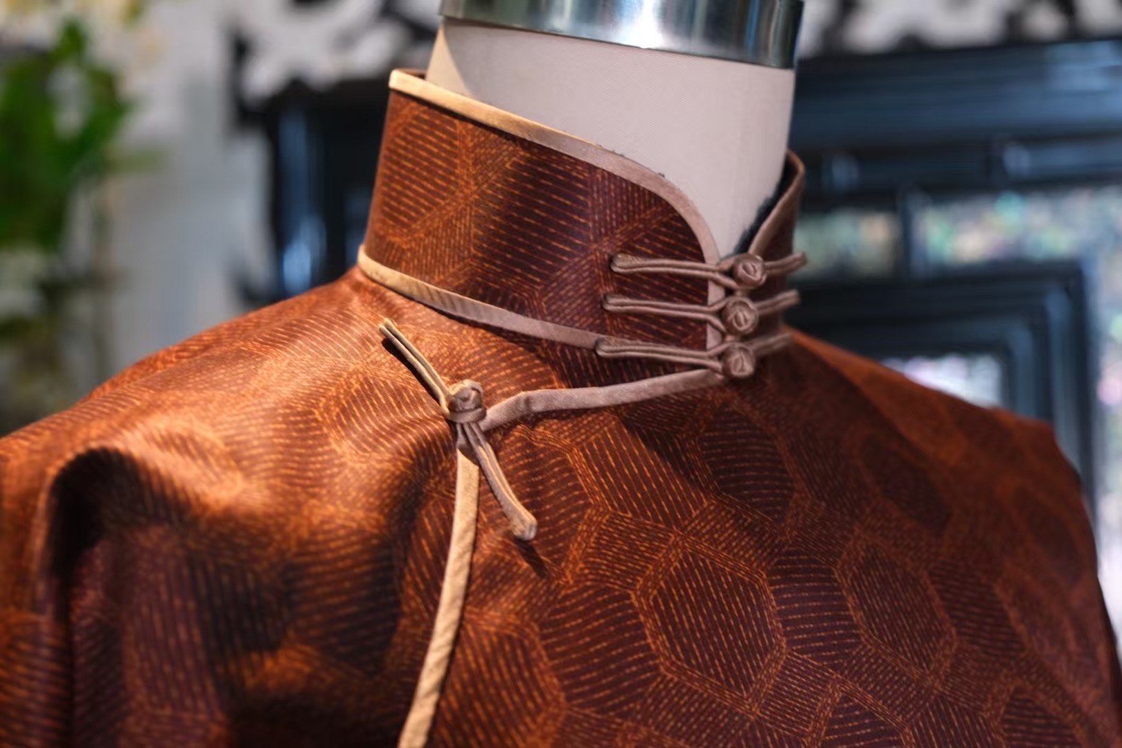 This Qipao is an artwork distilled from the confluence of time and exquisite craftsmanship. It utilizes 50 Momme Heavy Shunde Mud Silk ("Xiangyunsah") as its medium—a fabric that is more than mere material; it's a piece of history. The heavy silk provides a substantial texture and natural drape, while the unique "Pi Zi" characteristic lends its surface a singular sheen and feel, giving the deep russet hue an "Autumn Dusk Crimson" depth, like a fine, aged wine.