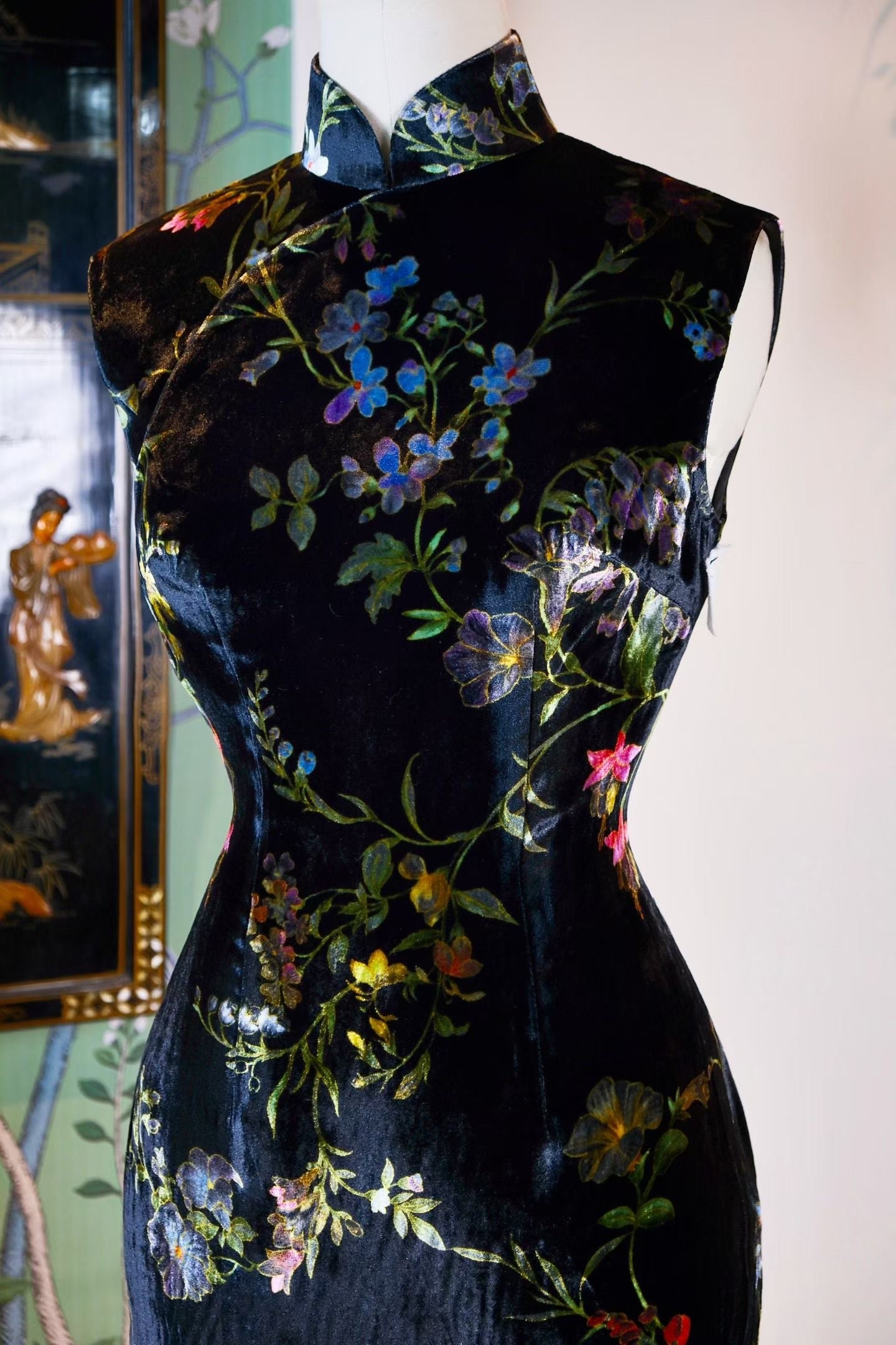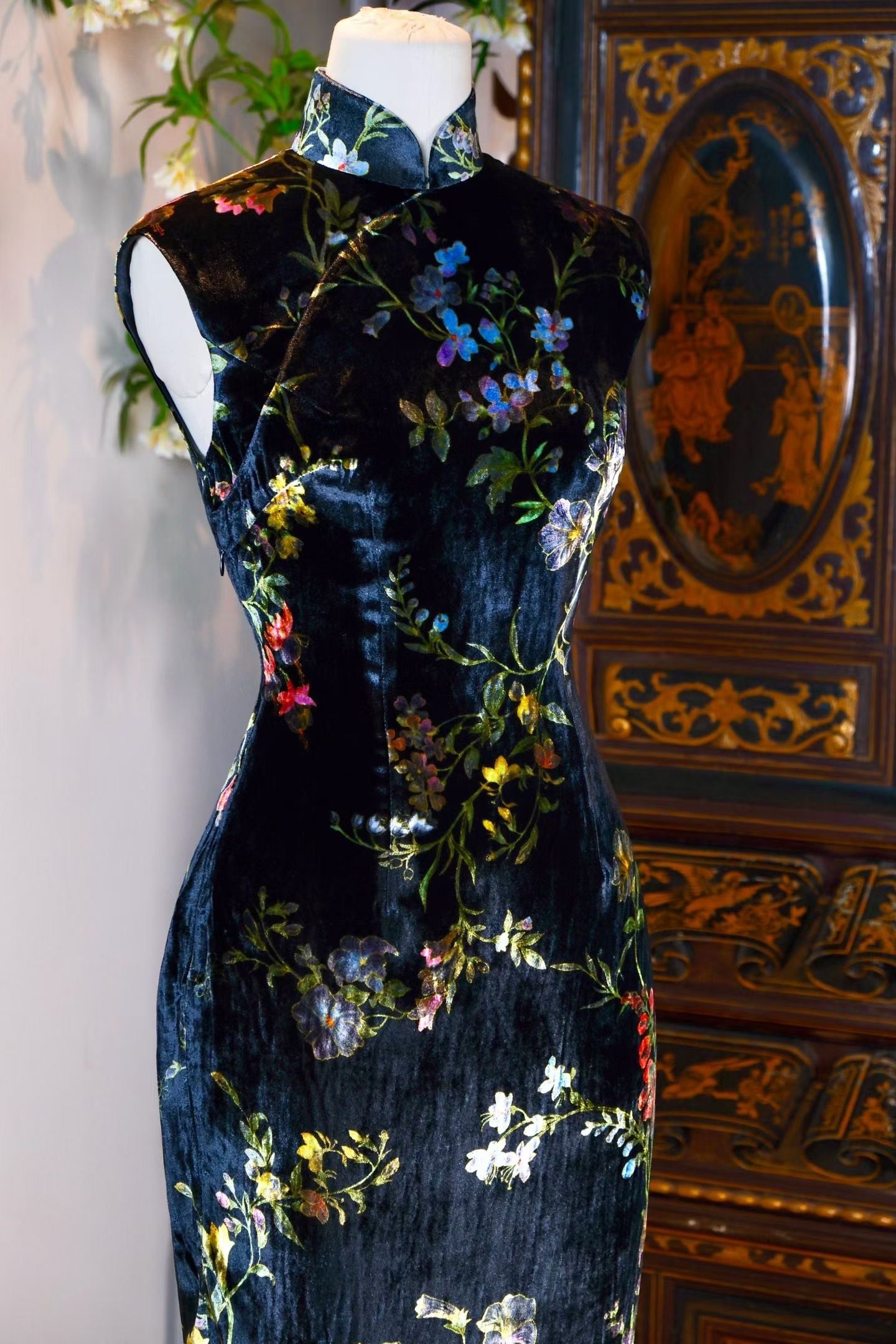 [Color: Ink-Wash Illusions and Modern Aurora] In terms of color, this garment completely shatters the dull stereotypes of the Qipao. It boldly draws from the "ink-wash" techniques of modernist painting, seamlessly blending verdant green, deep sapphire, romantic violet, and vibrant yellow upon the velvet canvas. There are no rigid boundaries; instead, colors permeate and flow like the Aurora Borealis. This striking visual performance transforms the silk velvet Qipao into a wearable piece of modernist art, where every inch of light and shadow is a unique monologue.