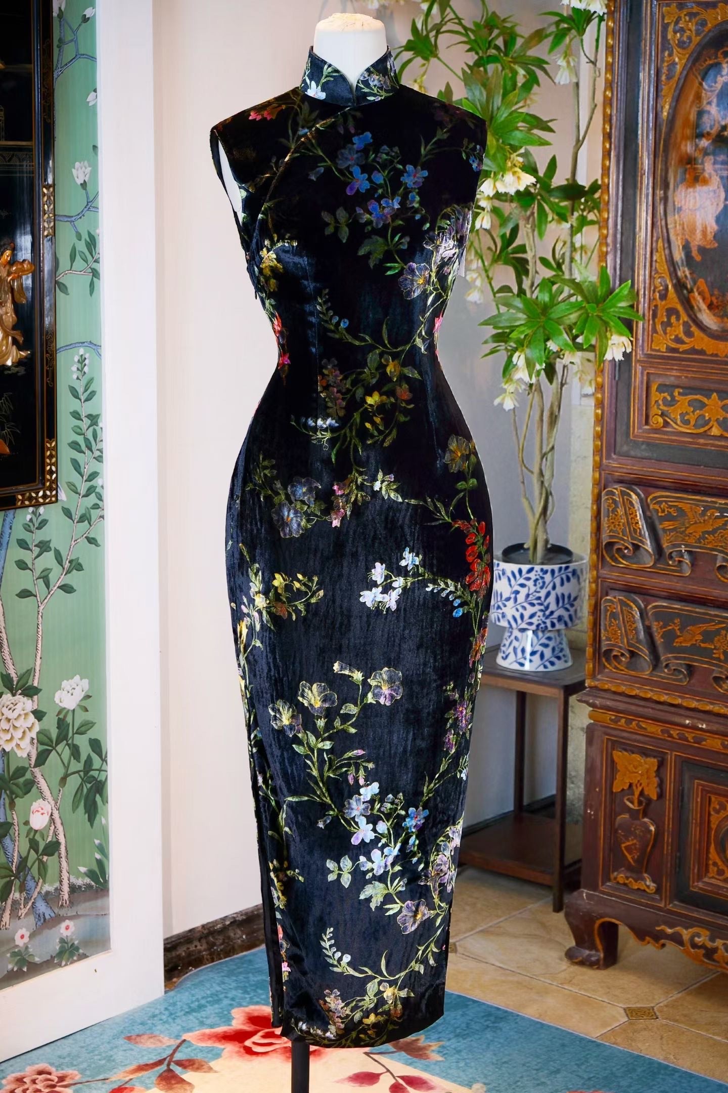 【色彩:泼墨幻境与现代极光】 在色彩的运用上,这件衣服彻底打破了传统旗袍的刻板印象。它大胆借鉴了现代派绘画的泼墨手法,将苍翠的绿、深邃的蓝、浪漫的紫与明艳的黄完美交融于绒面之上。色彩之间没有生硬的界限,而是像极光般自由渗透、流淌。这种极具冲击力的视觉表现,让这件真丝天鹅绒旗袍如同一幅可以穿在身上的现代主义画作,每一寸光影都是独一无二的独白。