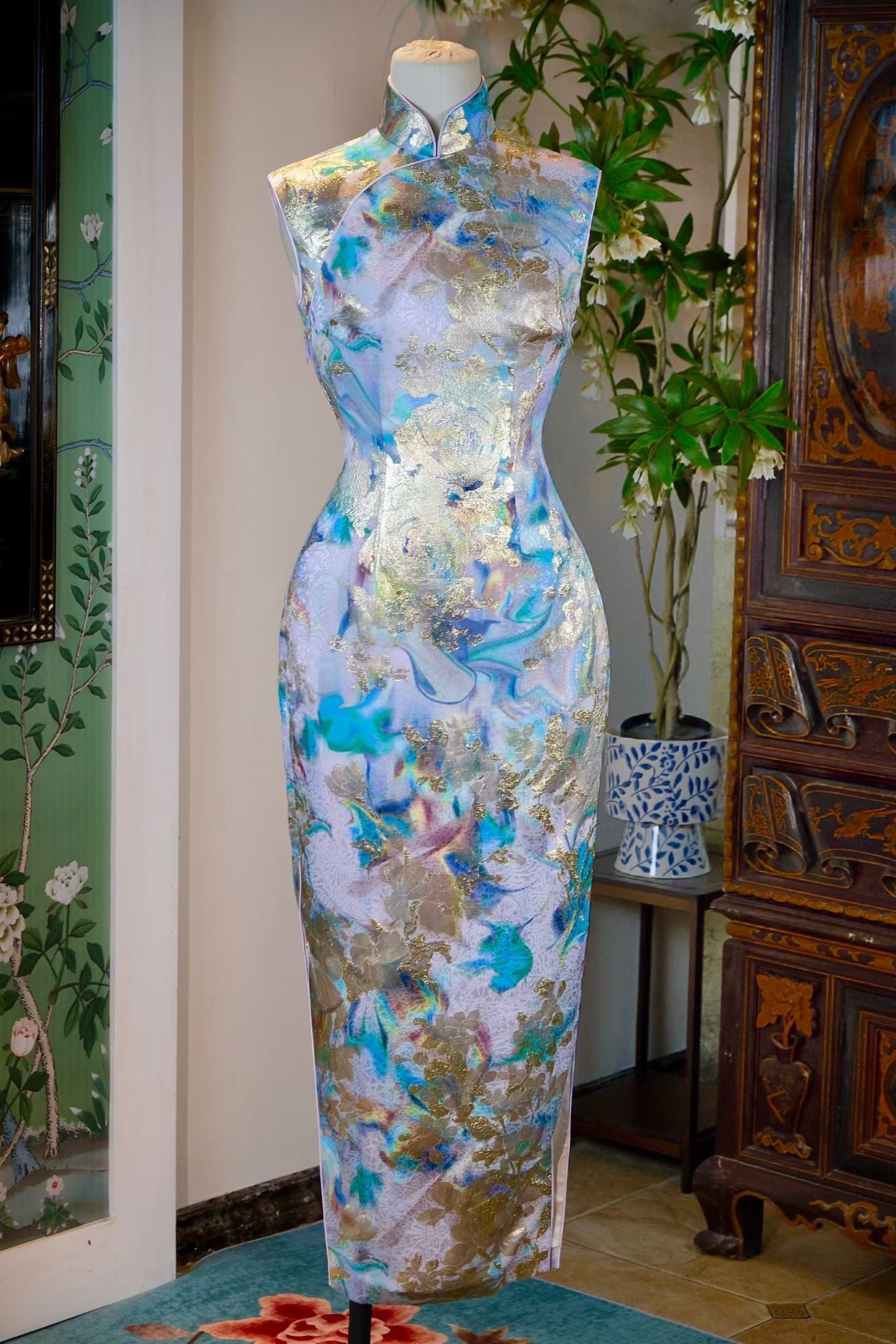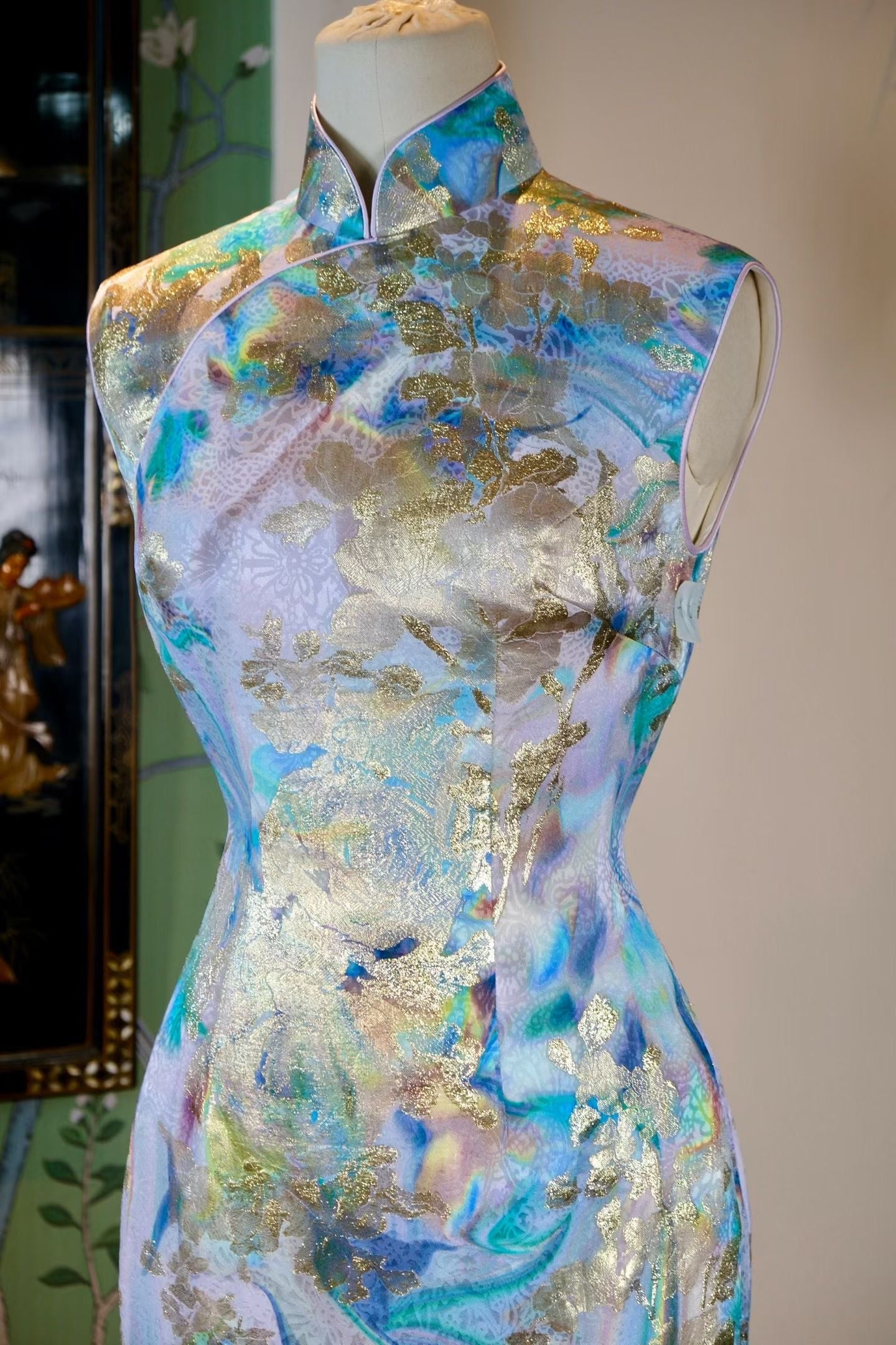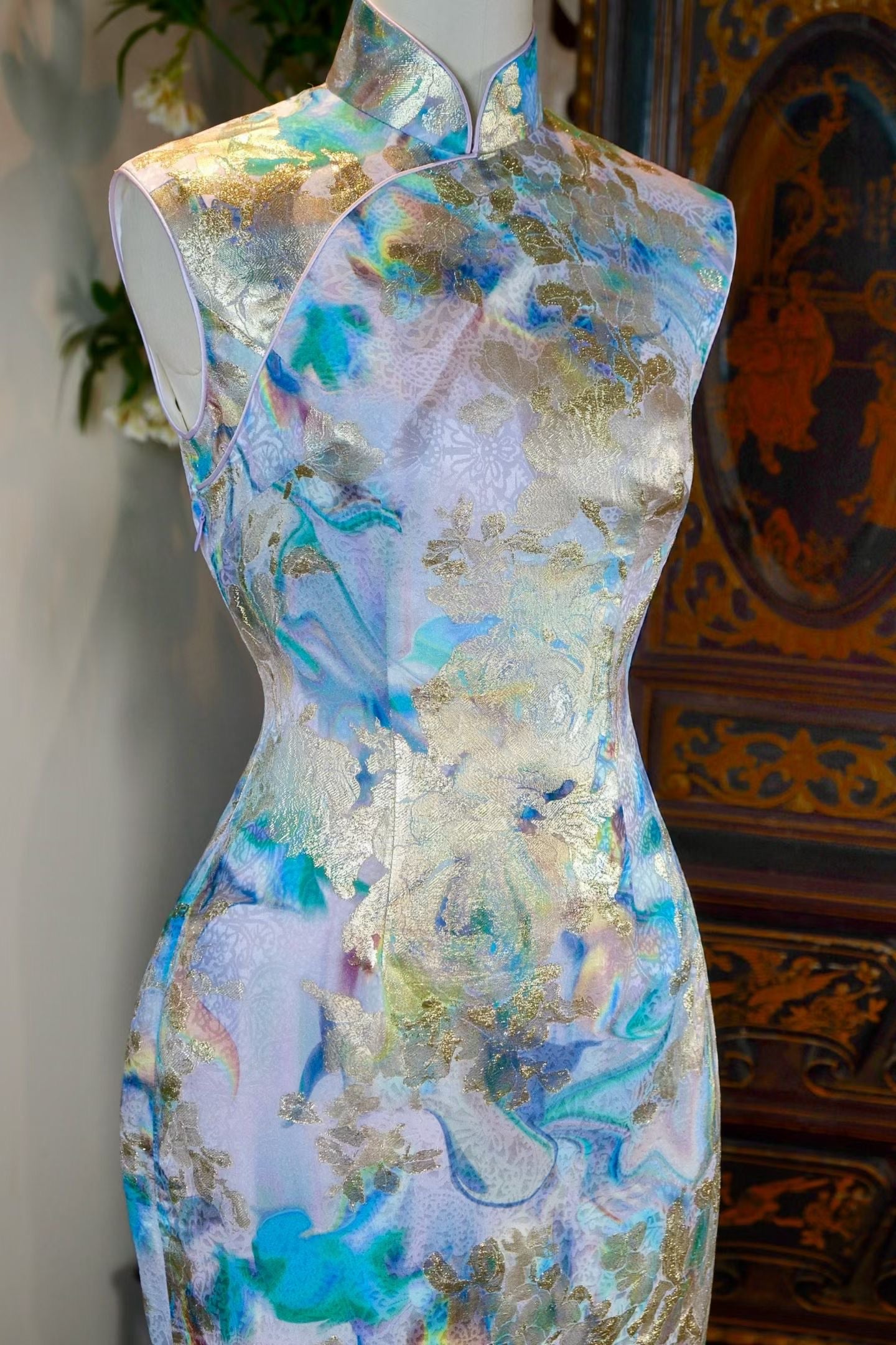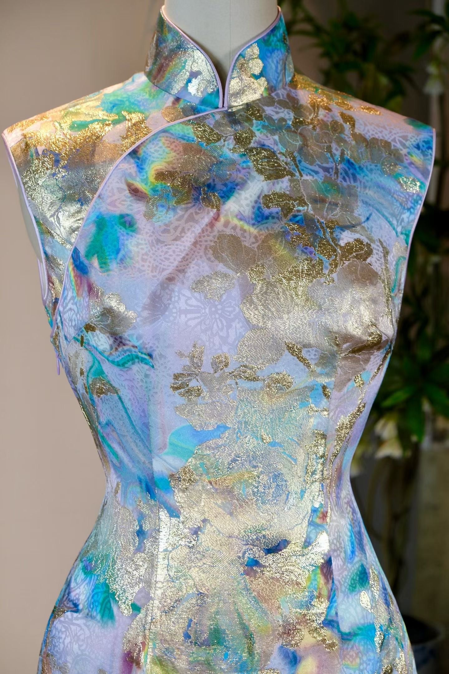 [Fabric: A Fluid Monet’s Garden — The Art of Ruffo Coli] The soul of this Qipao lies within its powerful fabric. We have selected an exquisite gold-woven silk jacquard from the world-renowned Italian mill, Ruffo Coli. The high-momme silk base provides a jade-like delicacy that breathes with the wearer’s body. The palette daringly abandons traditional Chinese schemes, blending dreamlike peacock blue, aurora green, and misty violet. Most breathtaking is the embossed gold-weaving technique; golden floral motifs emerge from the multichrome background like the first light of dawn hitting Monet’s water garden—shimmering, ethereal, and alive with light and shadow.