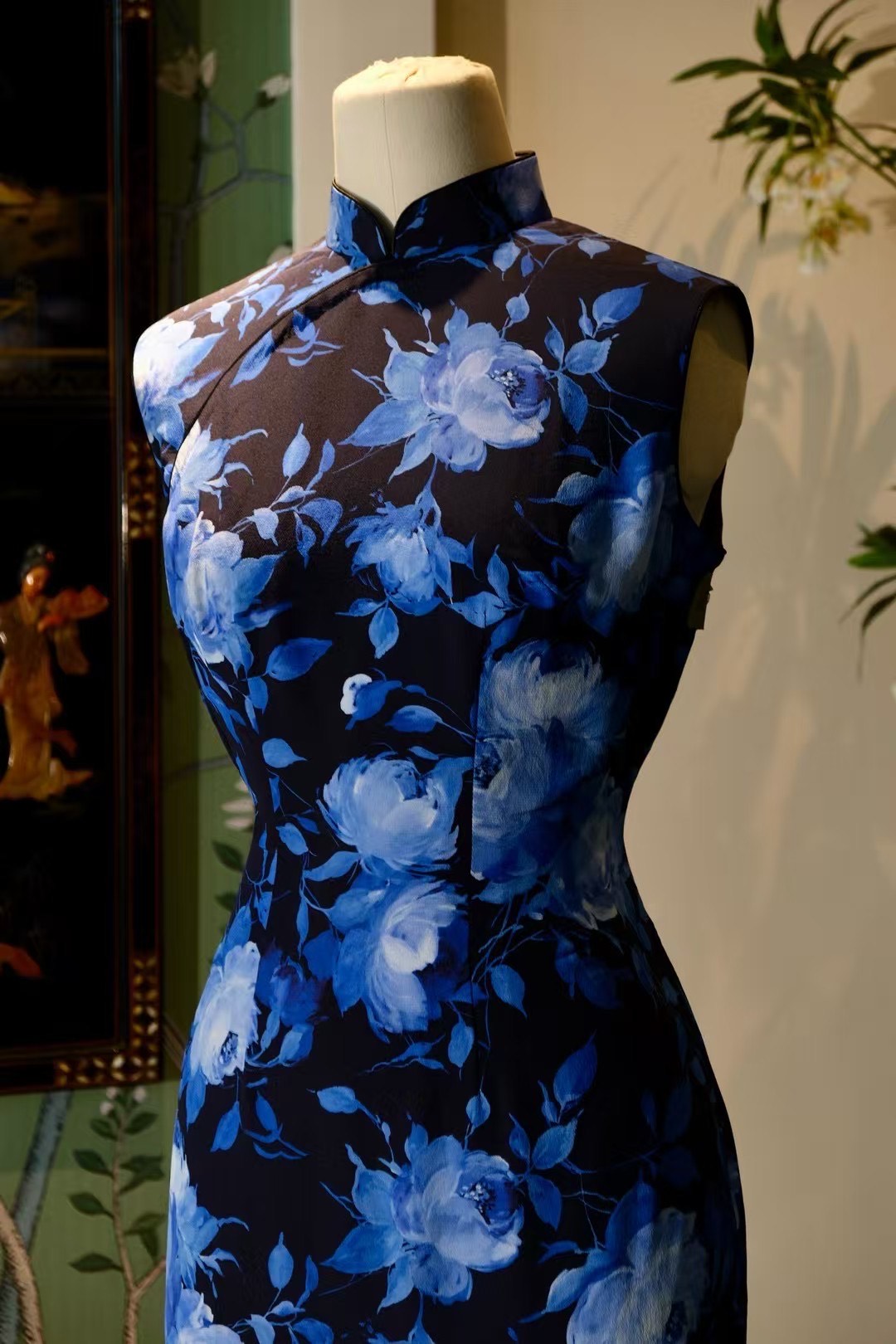 这件旗袍完美融合了青花瓷的沉静古韵与西方玫瑰的浪漫热烈,使之既适于出席正式的文化雅集,也能在现代社交场合中散发出清丽脱俗、遗世独立的迷人魅力。它不仅是一件服饰,更是一份将中国古典色彩美学穿在身上的独特表达。