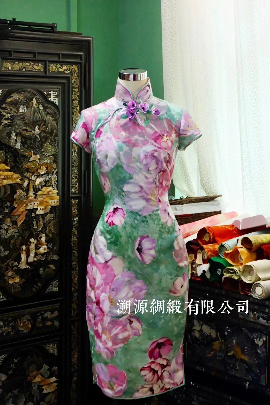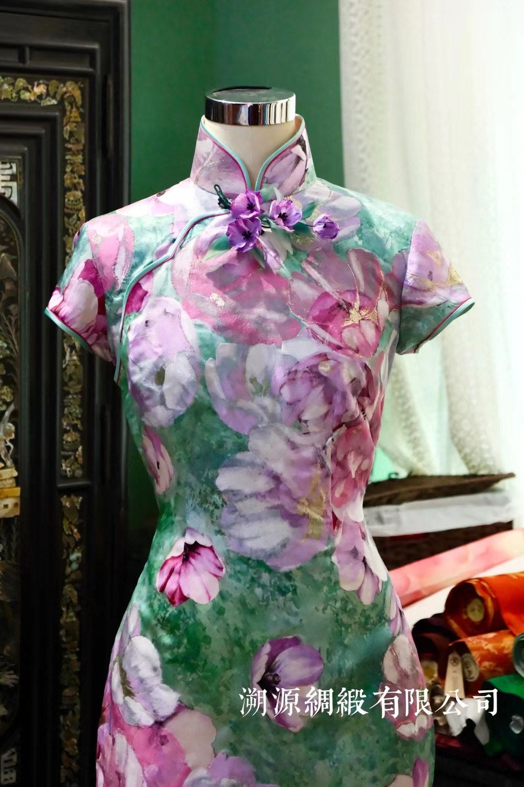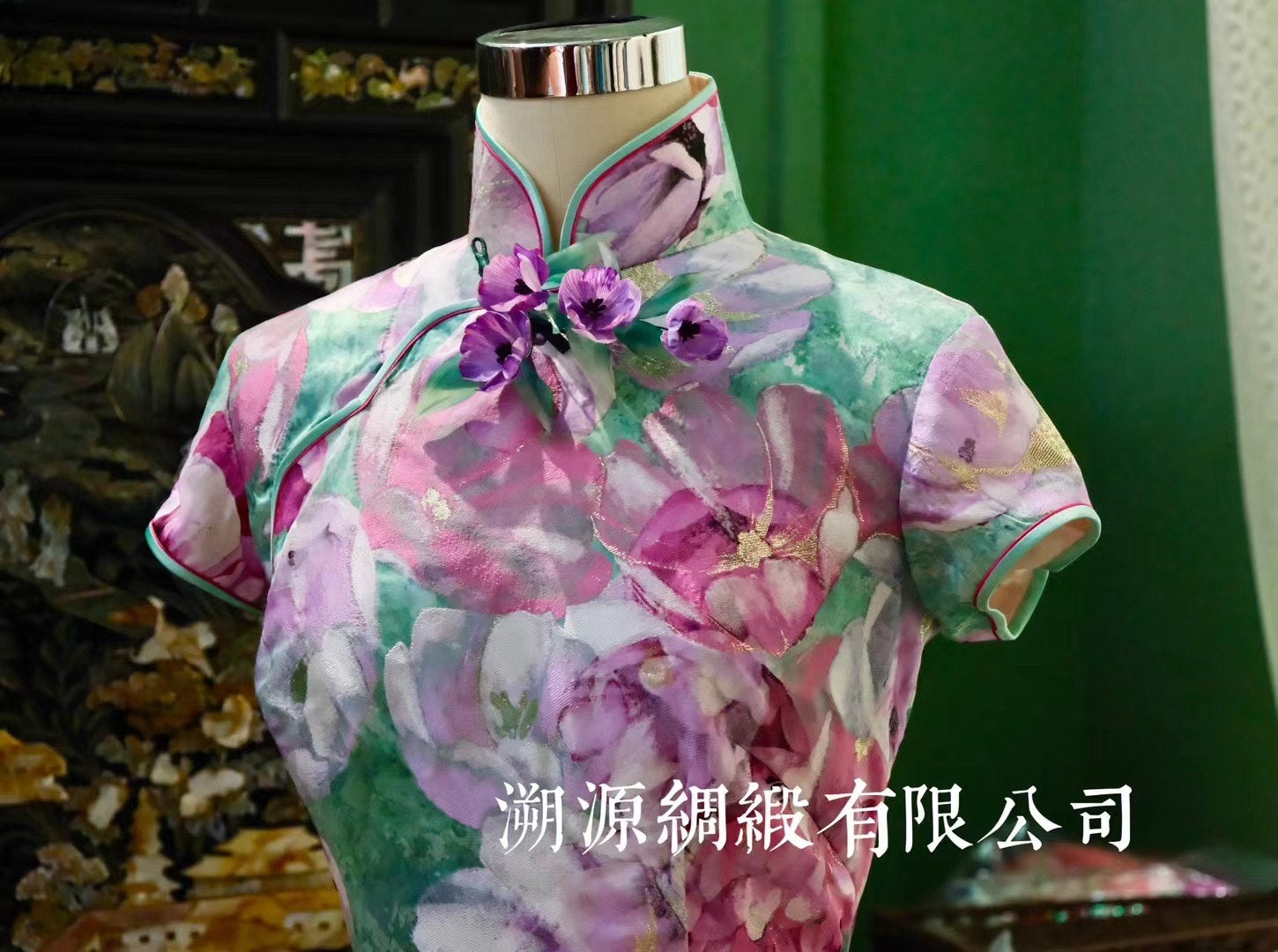 • 独家工艺与质感: 面料呈现出奢华的结构感和细腻的纹理,确保了旗袍成衣的挺括和优美垂坠。其上的花卉图案采用高难度的数码或喷墨印染技术,实现了水墨般晕染的艺术效果,色彩层次丰富,如画卷般展开。