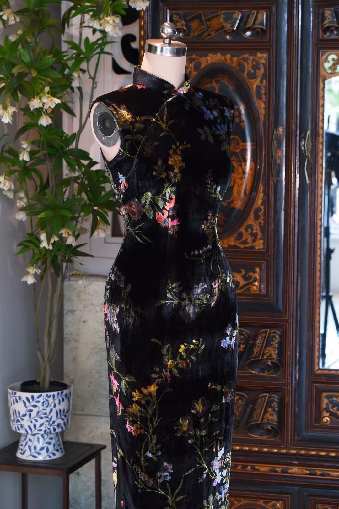 The base color of the qipao is a deep, inky black, whose velvety pile reflects light like a moonlit lake—mysterious and noble. Upon this canvas, florals such as peonies, hydrangeas, and wild blooms are lavishly scattered with oil-painting strokes. The complex printed silk velvet technique results in deep, saturated colors and distinct layers, making the flowers appear as if they were cut directly from an 18th-century Rococo tapestry.