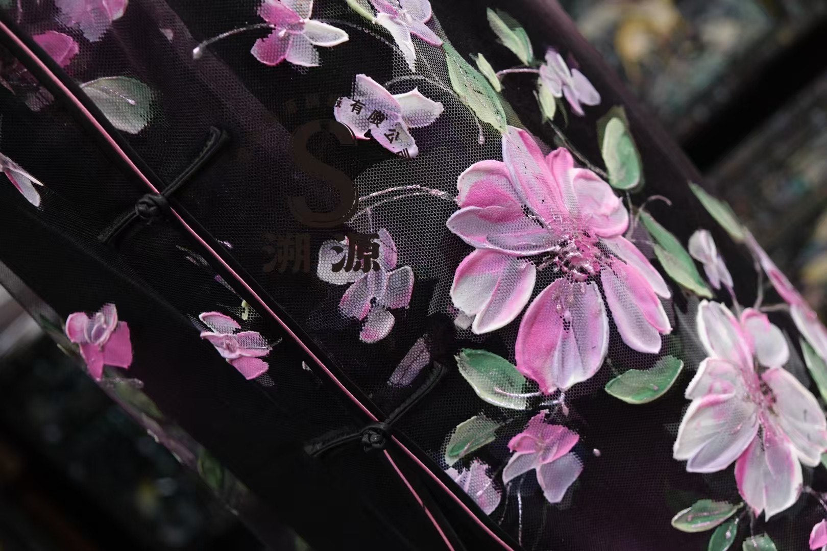 更值得称道的是,面料上的花卉图案并非工业印染,而是由匠人一笔一画精心手绘而成。粉白相间的花瓣,以立体油画般的笔触跃然于轻盈的薄纱之上,宛如夜色中绽放的幽兰,生动而富有层次感。每一朵花都凝聚了独一无二的生命力与艺术价值。
