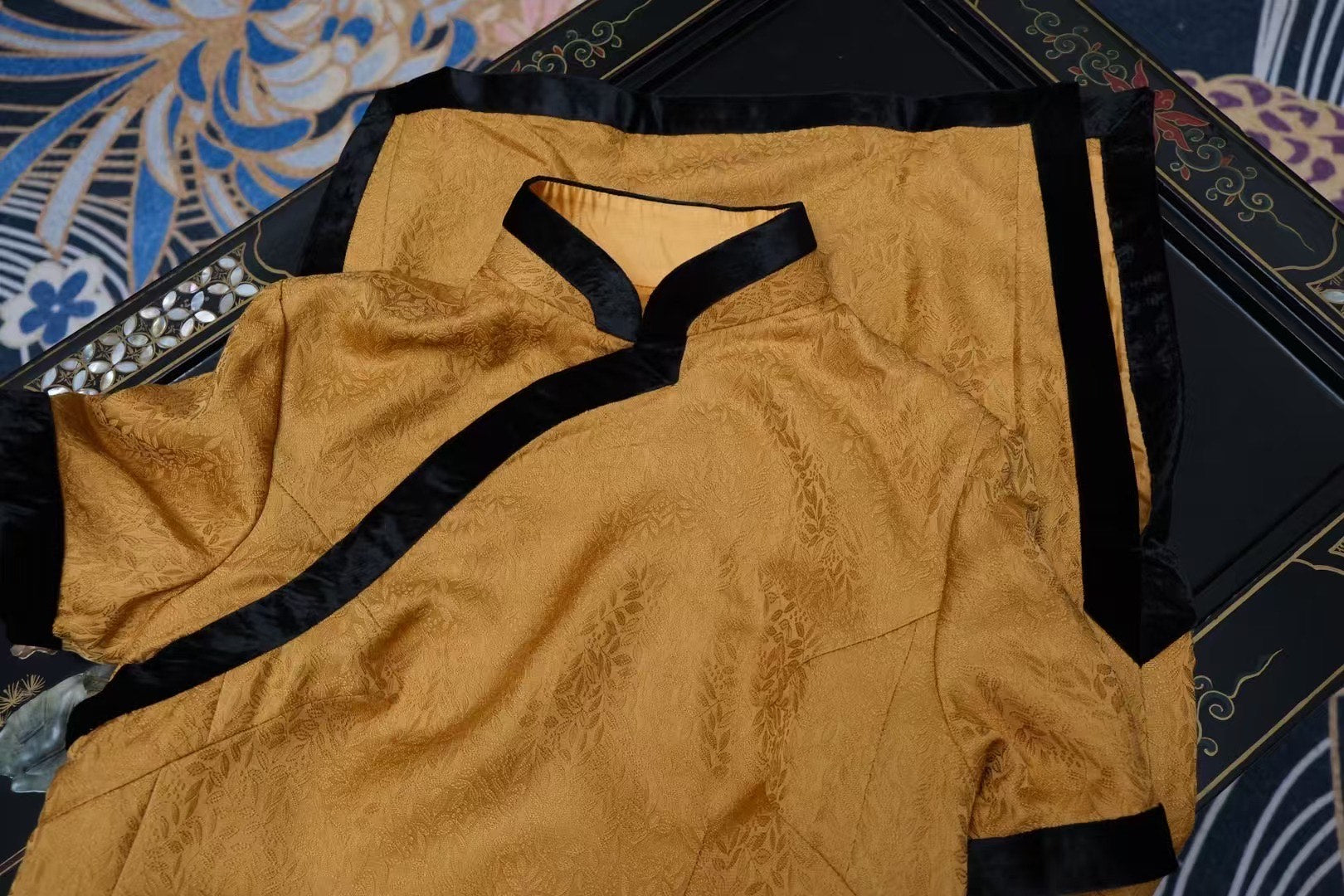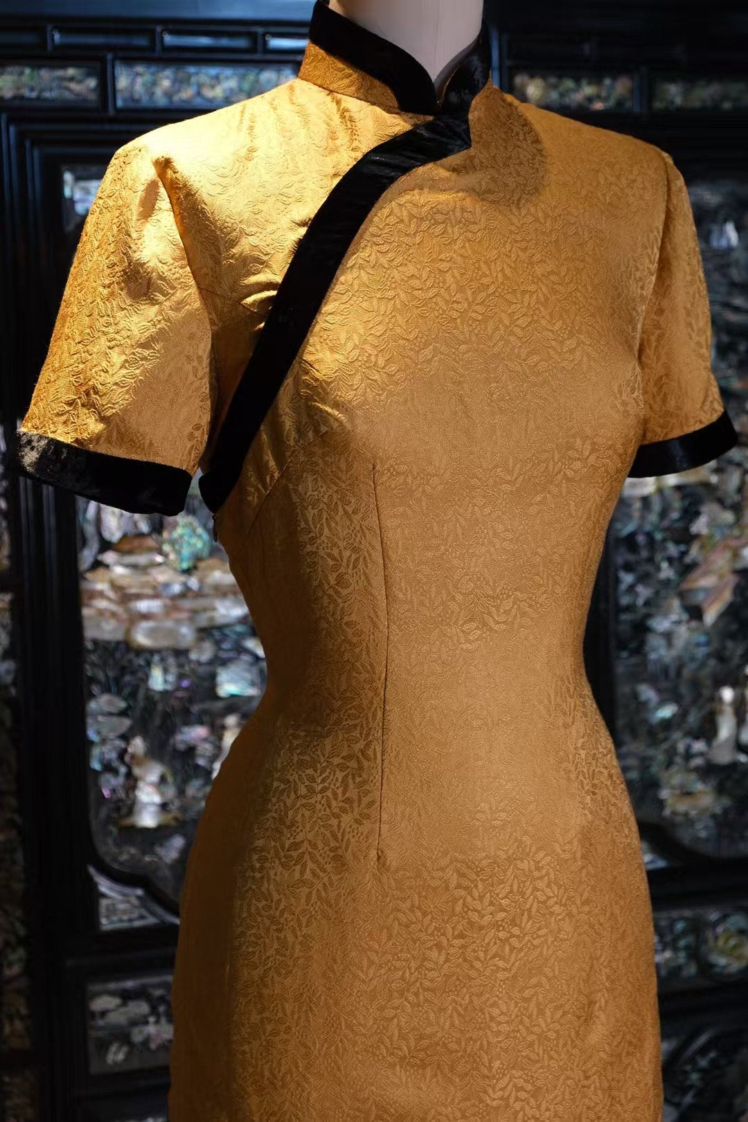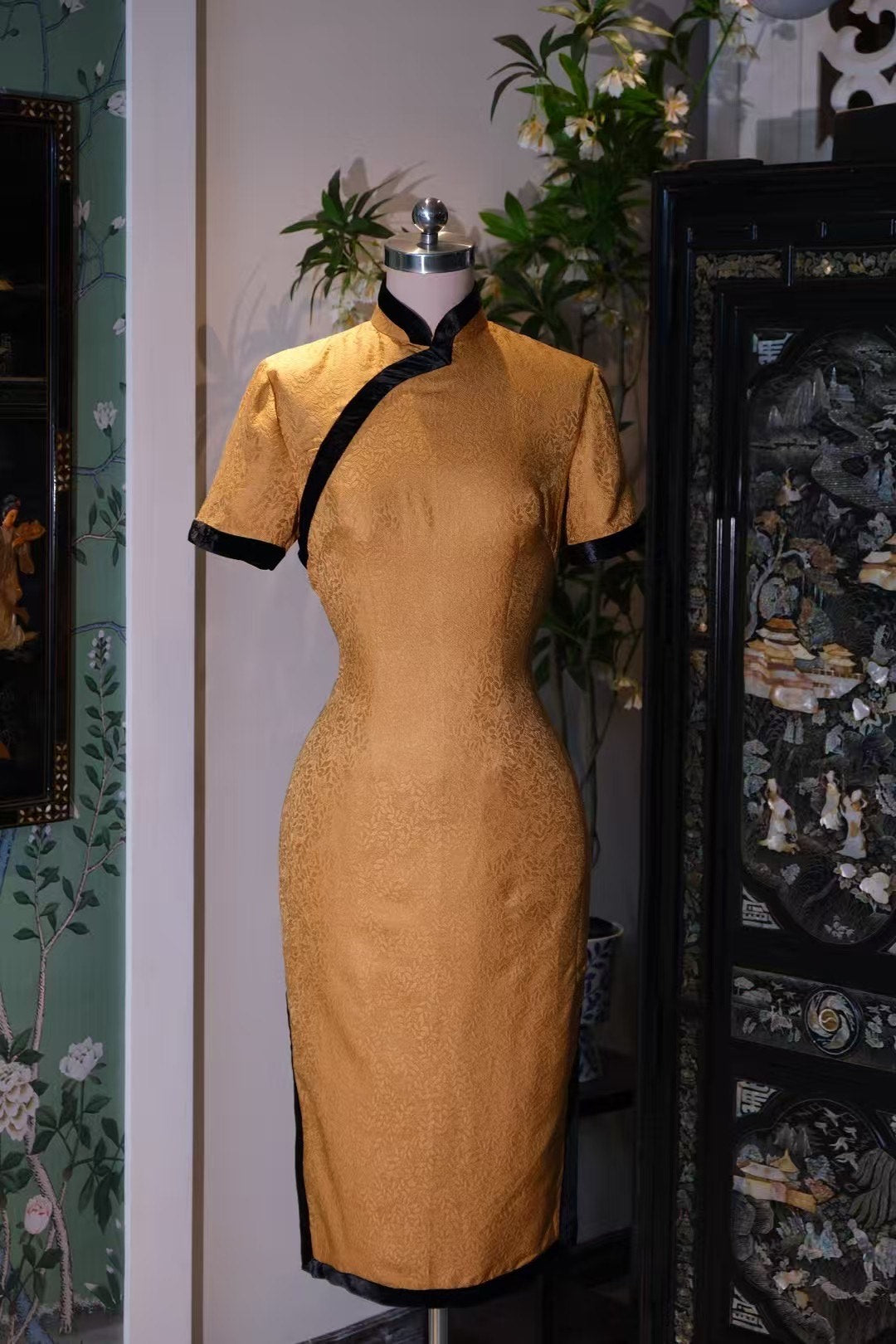客订结缘 - 摩登复古:经典焦糖金色花卉提花短袖旗袍,配黑色丝绒滚边 | Customized Design - Modern Vintage Glamour: Classic Caramel Gold Floral Brocade Cheongsam with Black Velvet Trims