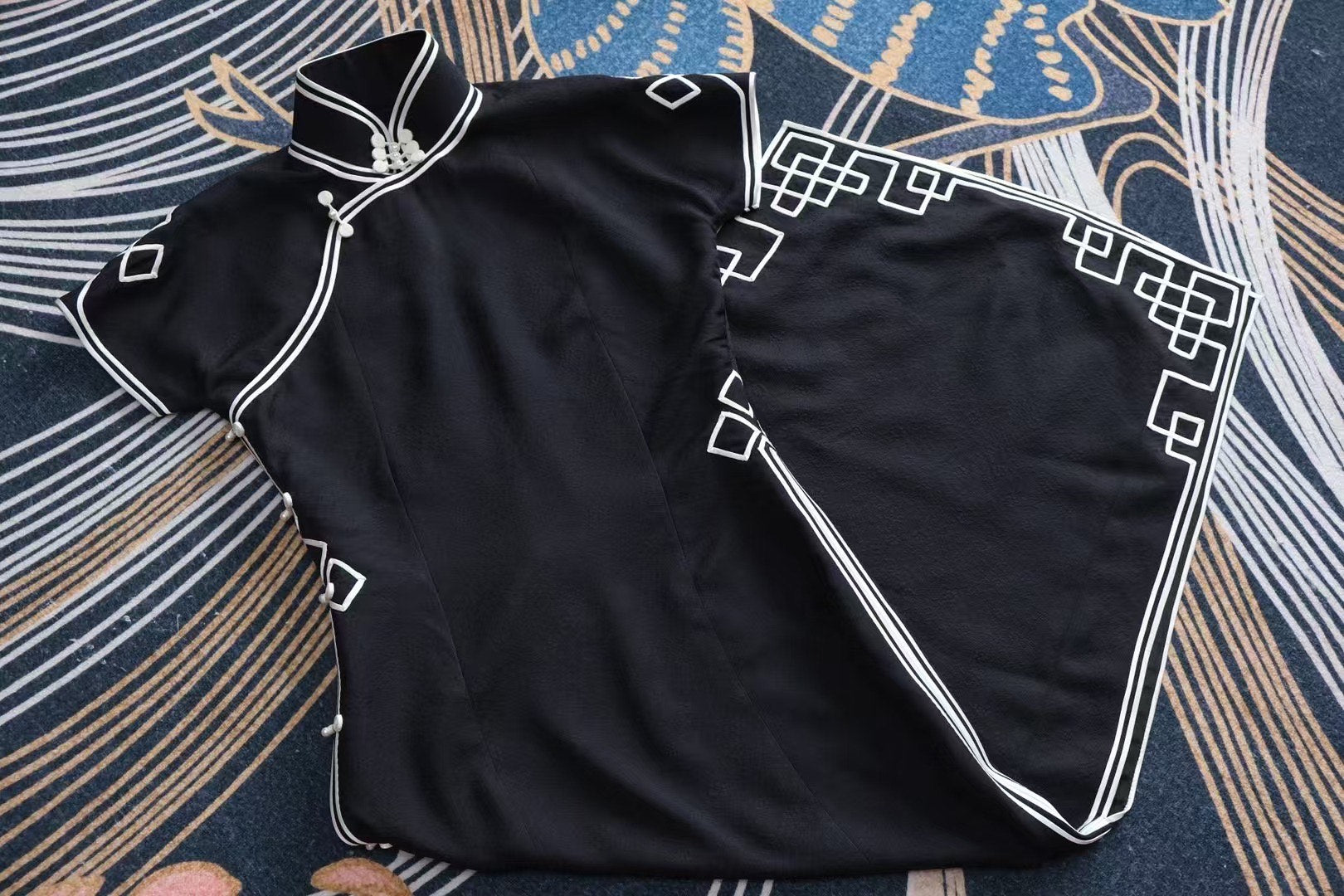 This Cheongsam is a masterpiece where classical elegance meets contemporary art. Eschewing traditional bright colors, it uses extreme black-and-white contrast to create a cool, mysterious, and modern aesthetic.