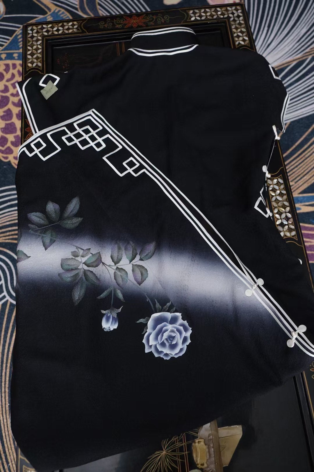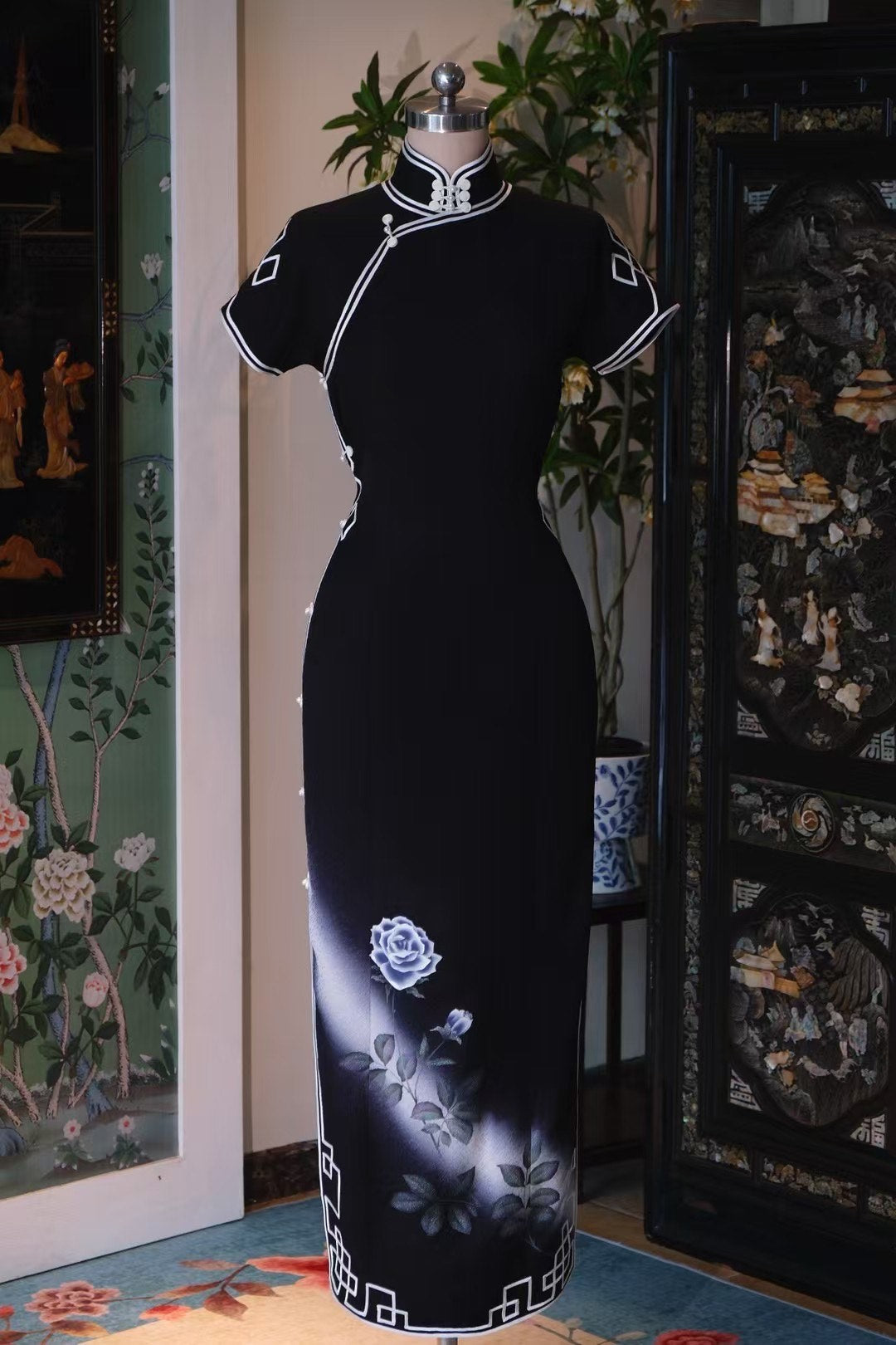 主题:旗袍的主体是深沉的黑色底色,裙摆处以水墨渐变的技法晕染出一抹灰白,并于其上“绽放”一朵蓝紫色调的暗夜玫瑰。图案笔触细腻,如同将一幅水彩画定格在裙身。