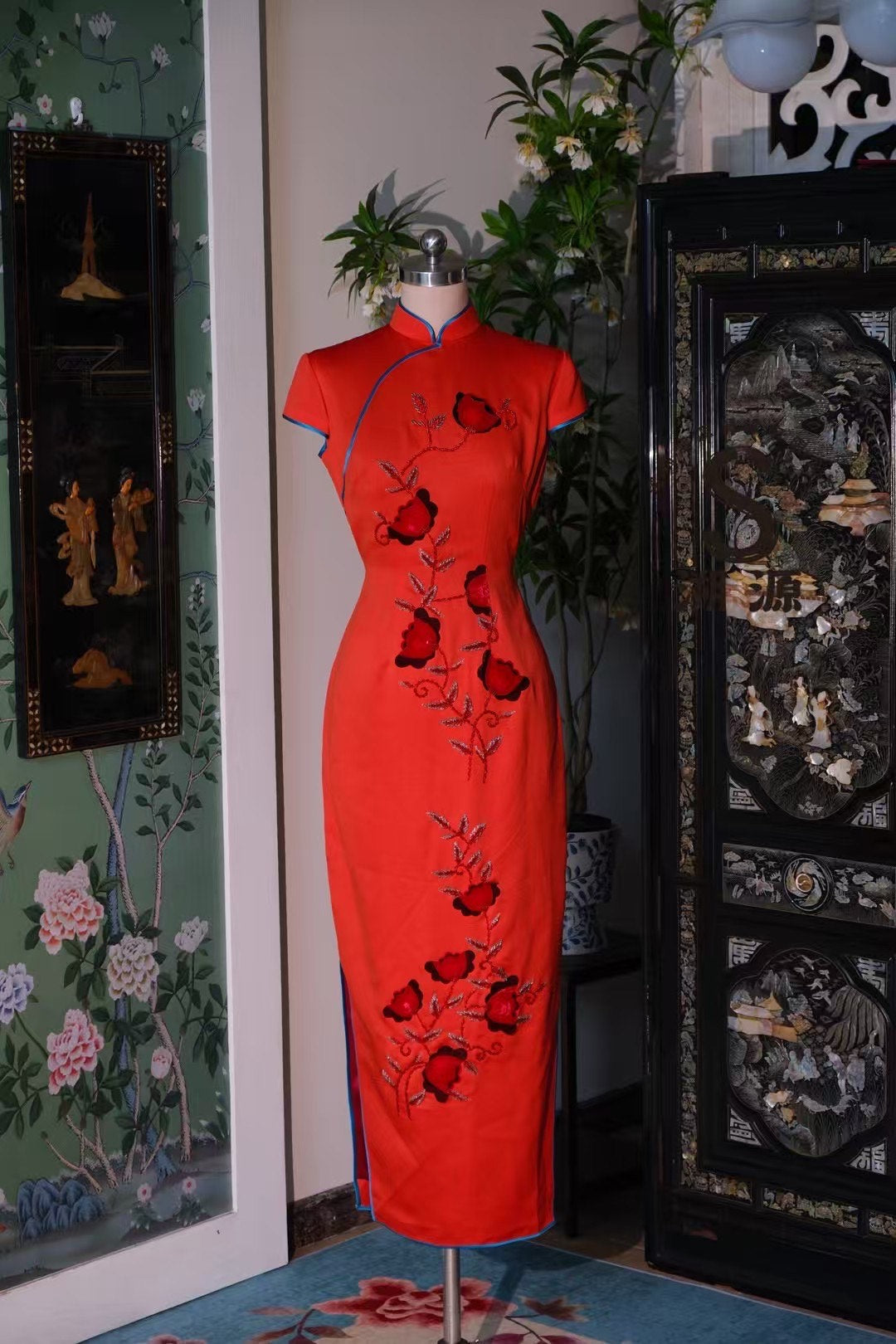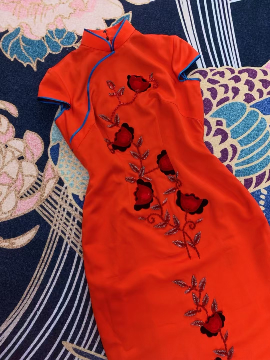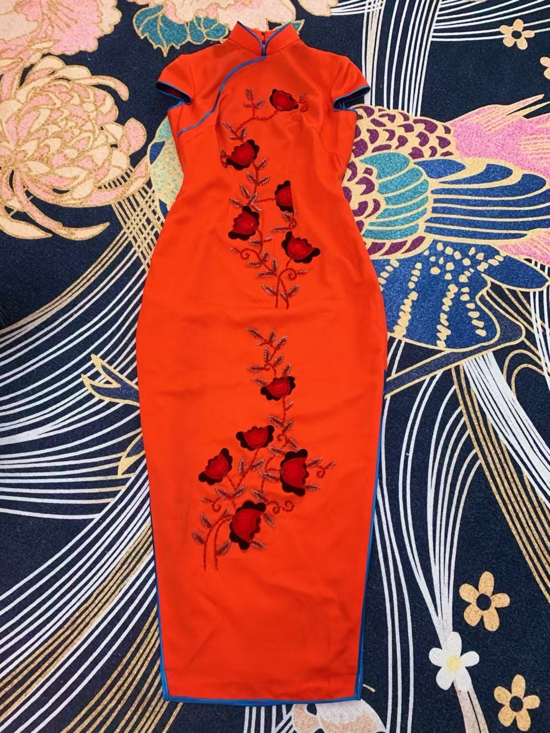 这件旗袍是东方古典美学与现代风情的绝妙交织。它以浓郁热烈的橘红色丝光缎面为底,色彩饱和而富有光泽,仿若日落时分天边的一抹朱华,瞬间点燃视觉焦点。