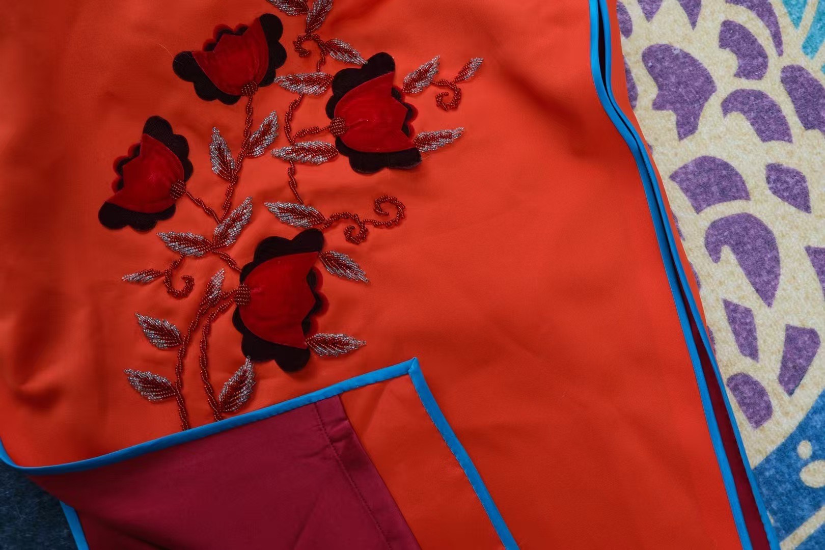 The true artistry lies in the dynamic, winding floral vine embroidery. The three-dimensional flowers, edged in black velvet and filled with vibrant red velour, bloom like passionate poppies against the orange canvas, both daring and graceful. The delicate branches and leaves are intricately woven with silver and red seed beads, shimmering with subtle luxury as they catch the light, creating a breathtaking sense of depth and texture. This is more than embroidery; it is a wearable, flowing tapestry.
