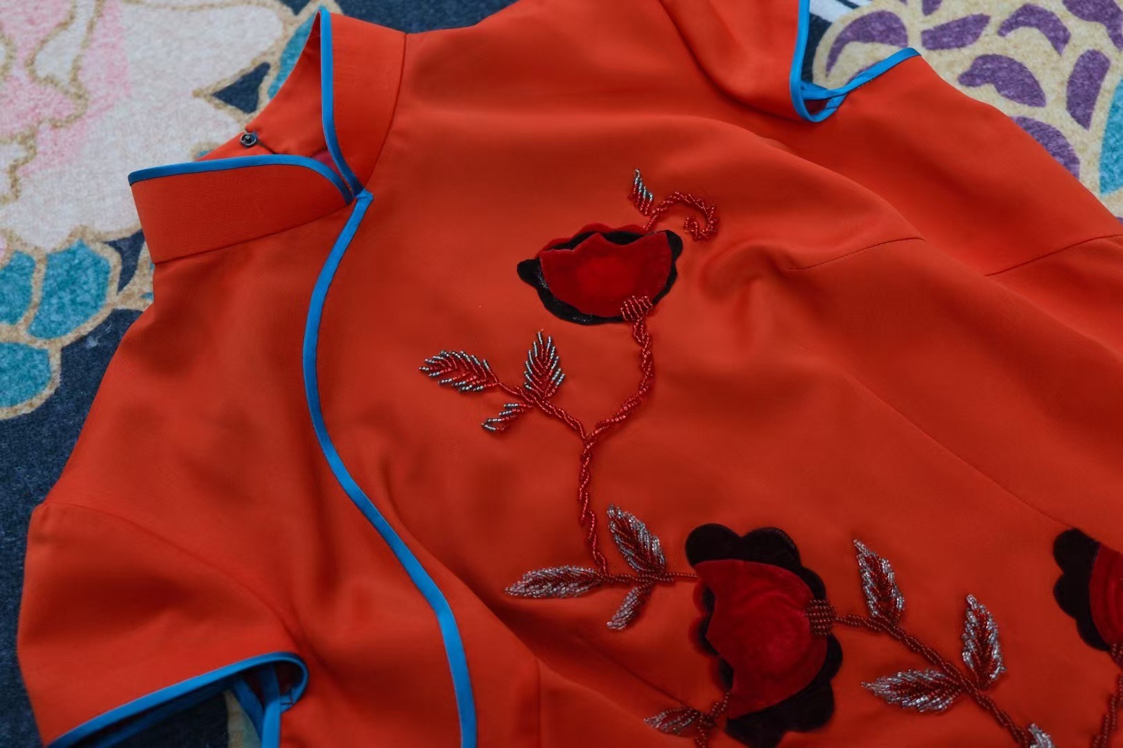 经典的立领盘扣修身剪裁,勾勒出女性玲珑有致的曲线,尽显婉约而自信的姿态。而那一抹跳脱的宝蓝色滚边,巧妙地勾勒在领口、斜襟与袖边,如同一道清泉注入炽热的色彩之中,是整件旗袍的“点睛之笔”,平添了几分灵动与时尚感。