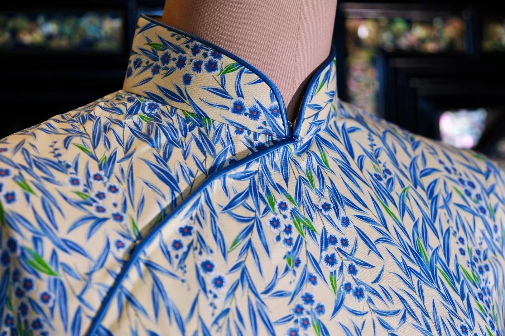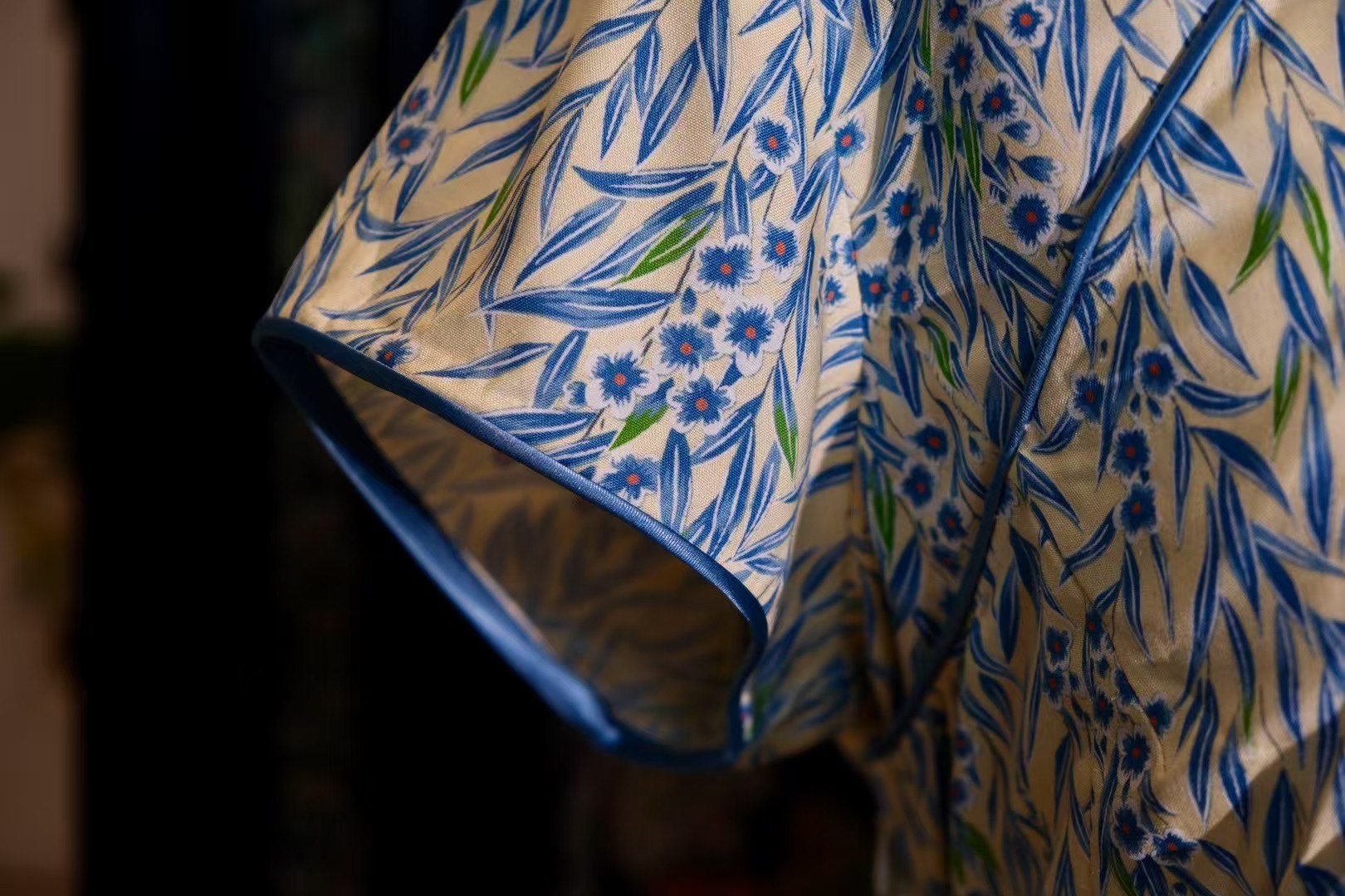 Design Highlights: The classic mandarin collar and diagonal opening (xie jin) are designed to sculpt an elegant Oriental curve, perfectly flattering the wearer's figure. The placket, collar, and sleeves are all finished with a serene blue piping, mirroring the blue floral pattern on the fabric, a detail that speaks of high-quality craftsmanship. The short-sleeve design adds a touch of fresh grace and vibrancy, ensuring that whether for daily wear or elegant occasions, it showcases the wearer's unique blend of classical and modern charm.