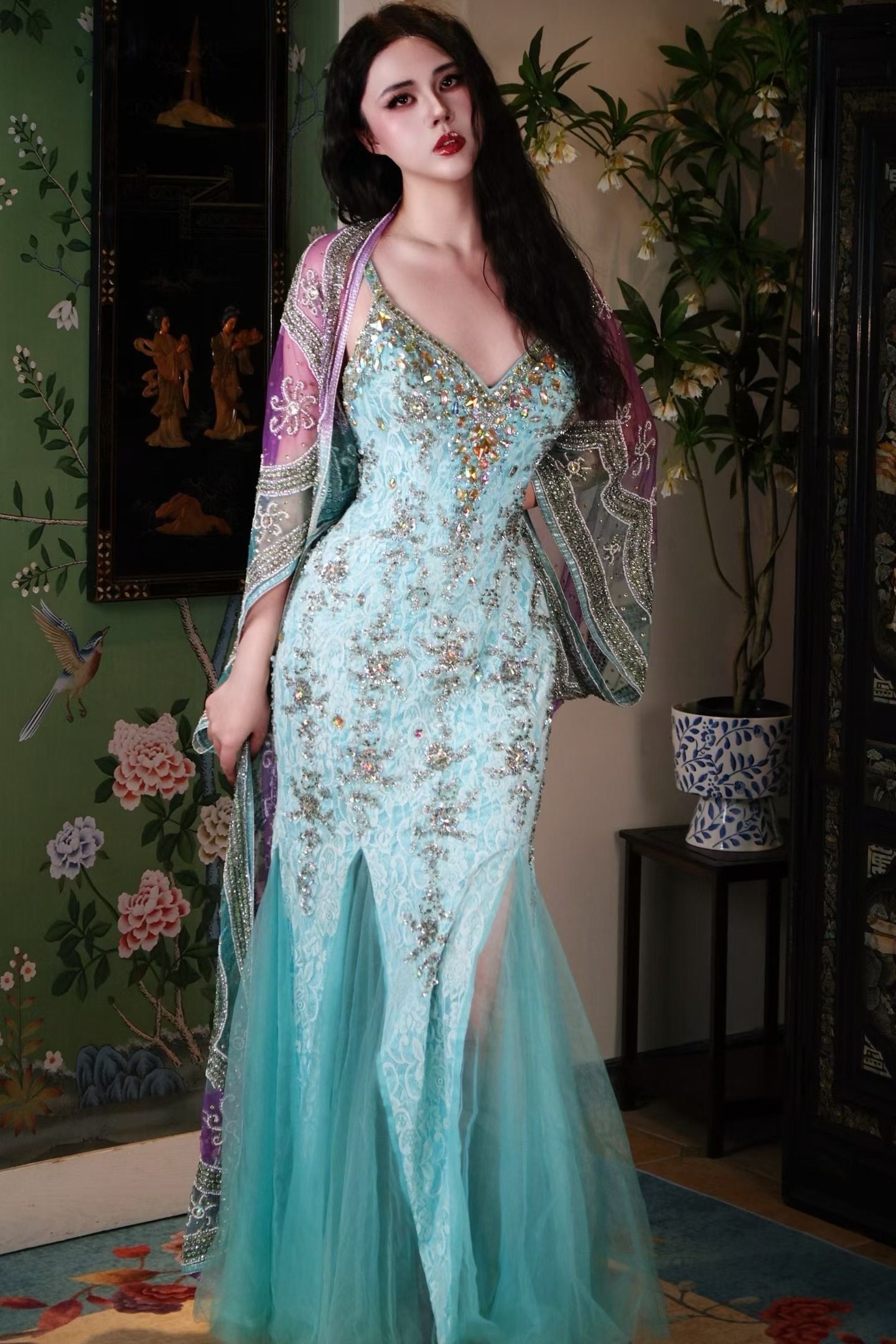 This evening gown ensemble is a magnificent fantasy of the sea and the stars. The main dress features a clear, aqua blue hue, with a sleek mermaid silhouette that gracefully sculpts the figure. The sheer tulle at the hem flares out like ripples on the water, imbued with a deep sense of romance.