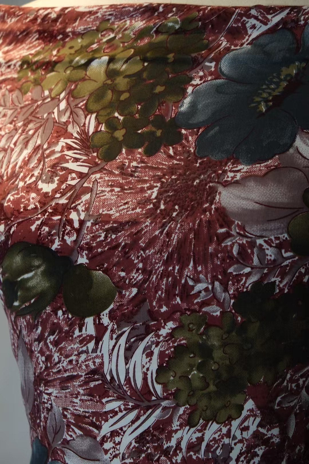 图案采用大面积的金色描绘出古典的玫瑰花束与藤蔓。这些金色花叶并非简单的平面印花,而是通过一种精湛的鎏金工艺,在布料表面呈现出浮雕般的立体感和刺绣般的细腻纹理。金线勾勒出花瓣的边缘和叶片的脉络,在任何光线下都散发着低调而永恒的金属光泽。