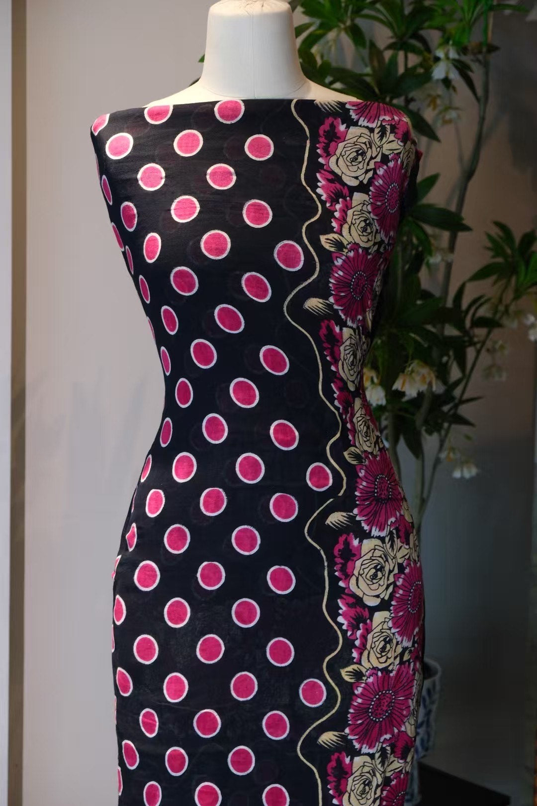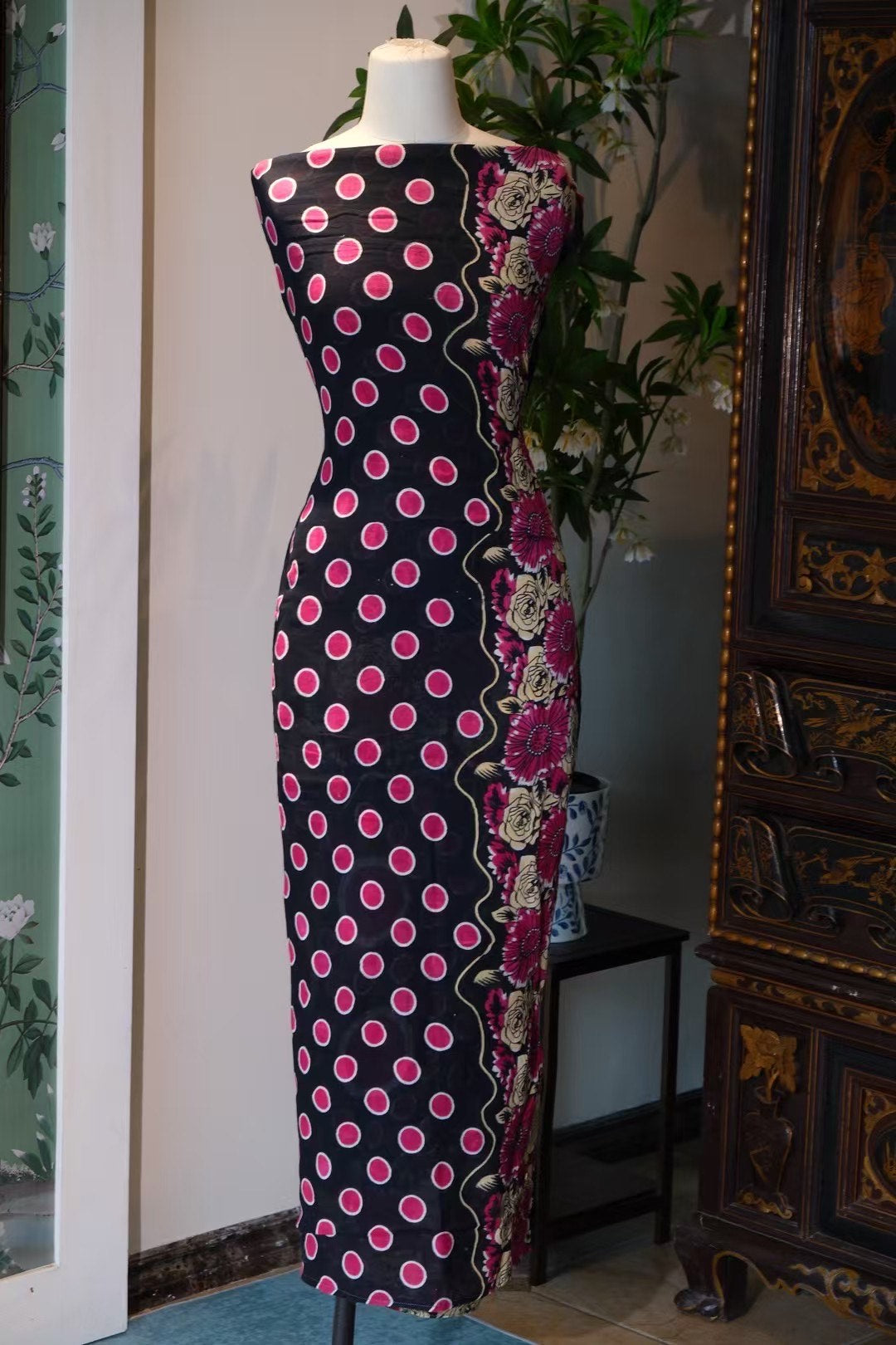 布料主体以深邃的夜空黑底色为主,其上规律地铺陈着抢眼的玫红色圆点(Polka Dot)。这种大胆、重复的几何图案,充满了上世纪中期的摩登与俏皮的活力,营造出一种眩目的视觉节奏感。
