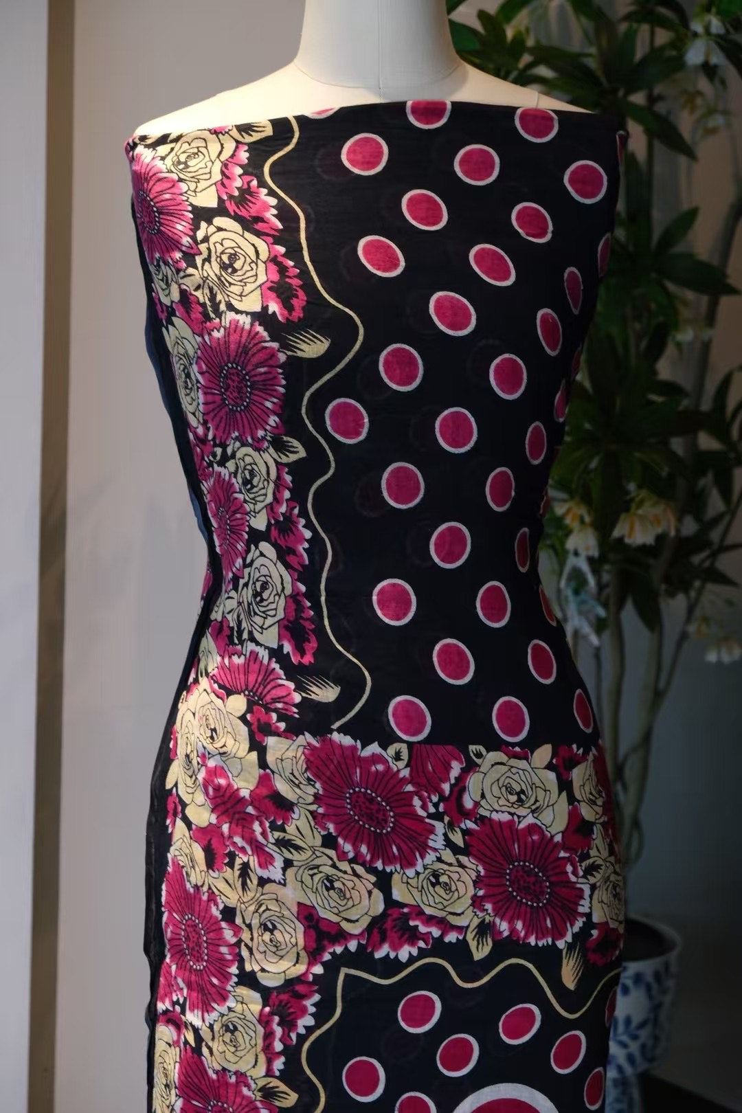 This art cloth exhibits excellent drape and a smooth visual finish. This dual-style design offers boundless customization possibilities—whether utilizing the dots to emphasize dynamic movement or the florals to highlight graceful curves, it is destined to be the most talked-about piece of your creation. It is the perfect choice for bespoke gowns, party attire, or creating eye-catching accessories.