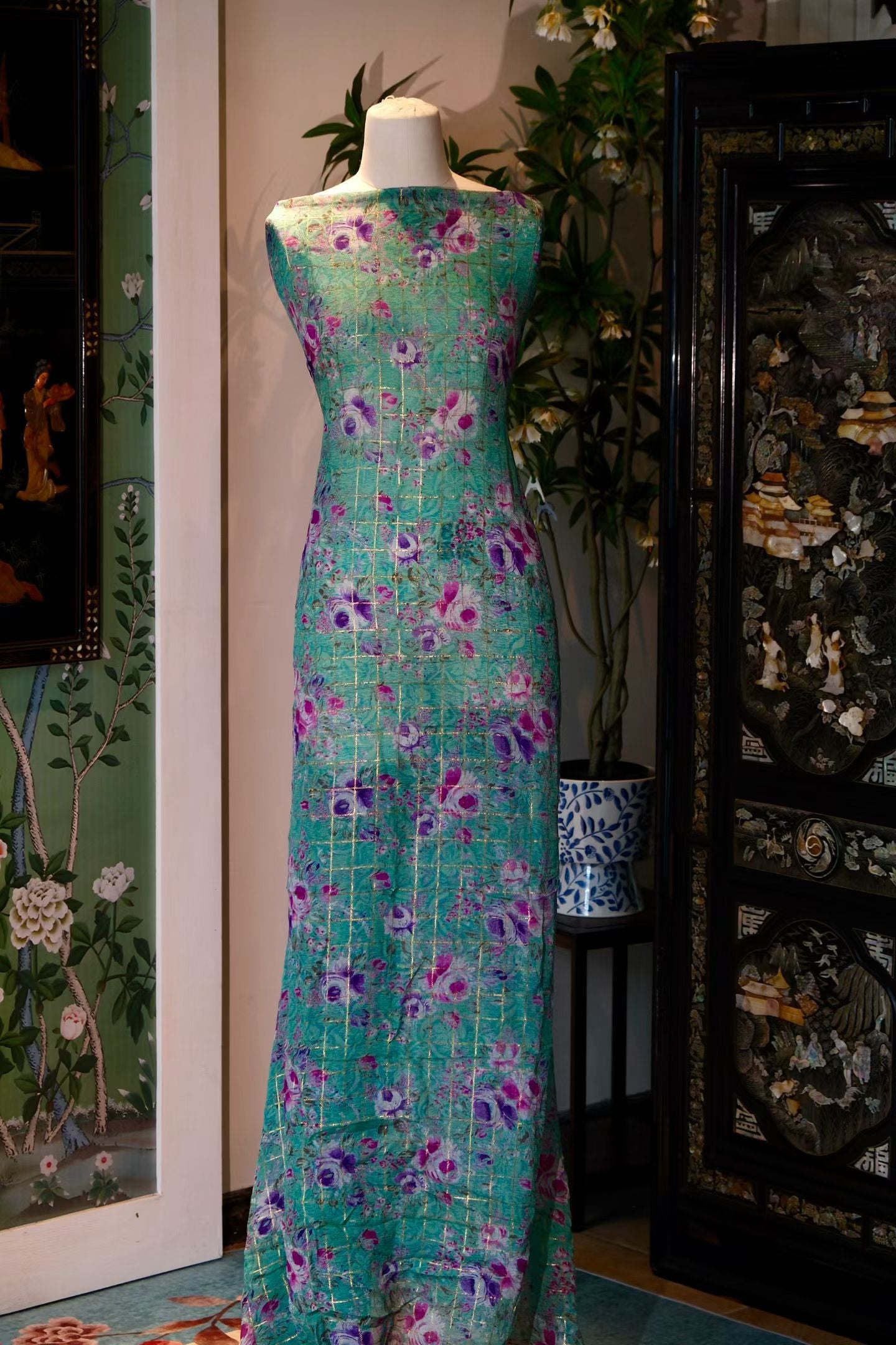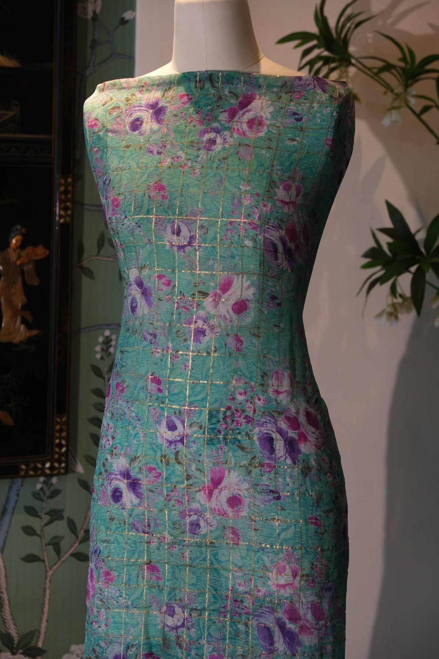 面料基底是令人心旷神怡的薄荷绿色,其上铺满了紫罗兰和粉色的玫瑰花影,色彩交融,梦幻而又甜美。最为点睛之笔,是面料上细密交织的金色格纹,如同花房的玻璃窗,又似阳光洒下的道道微光,在轻薄的丝绡之上闪烁着低调的华丽。