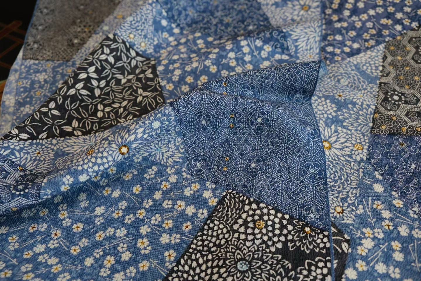 它借鉴了日本传统Boro(褴褛拼布)和蓝染工艺的精华,将多种细密精致的千代纹、菊花、麻叶和碎花图案以独特的几何块面形式印染于一身。深浅不一的靛蓝色如同水洗的牛仔布,带着岁月的沉淀与温度。看似随性的拼贴,实则承载着古典纹样的美好寓意。