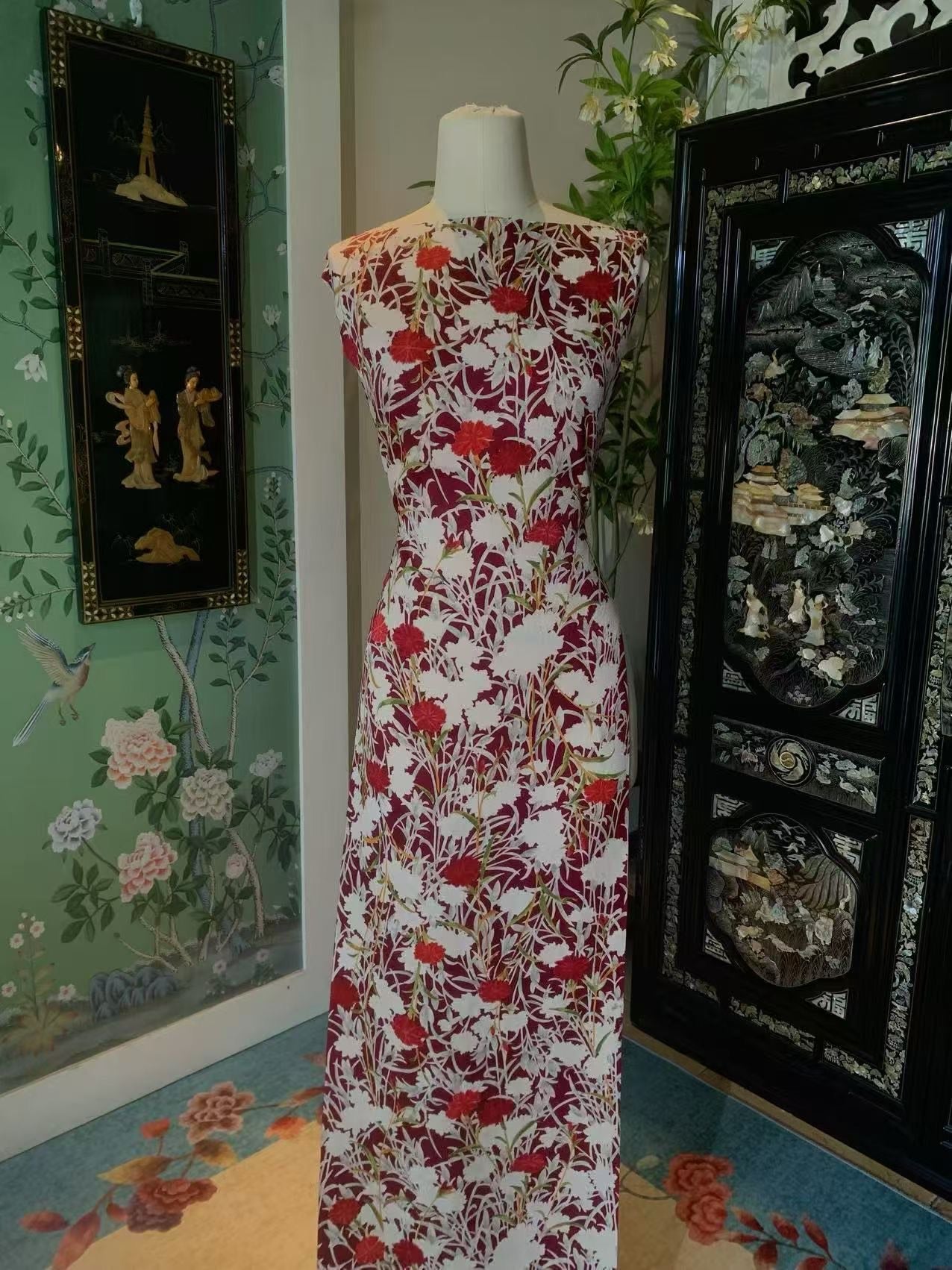 绛雪初染,风华盛放,热烈而含蓄的东方之美。” 「绛雪繁花」面料以醇厚的酒红色为基调,衬托出白色花卉图案的盛放与娇媚,宛如夜色下热烈而浪漫的花事。繁密精致的花叶纹理,赋予了面料奢华的手感和视觉冲击力,象征着喜悦、热情与好运。它将古典的富贵华丽与现代的时尚感完美融合,是旗袍或重要庆典礼服的绝佳之选。
