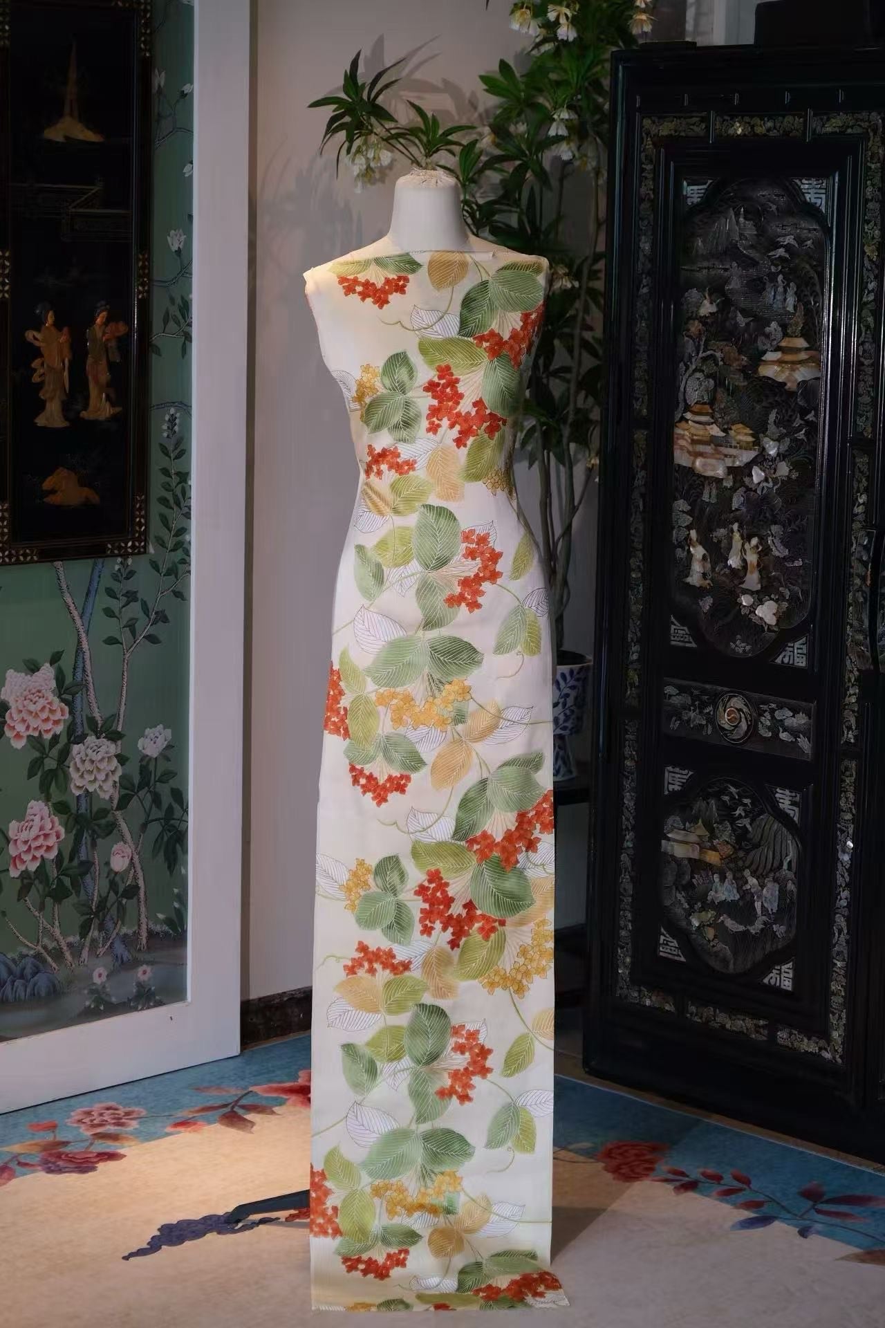 “丹枫迎秋”布料,以温润的米白或淡奶油色为底,如同清晨的薄雾,柔和而雅致。其上满布着藤蔓状的图案:层次分明的浅绿、深绿色叶片舒展交错,并巧妙地点缀着金黄与鲜艳的橙红色花朵。这些花朵如火焰般热情绽放,色彩对比强烈而和谐,充满生机。 整体图案呈现出一种向上的、流动的生命力,仿佛将热烈的花开和自然的馈赠融入布帛之中。它非常适合为修身服饰增添一份热情与活力,避免了纯色系的单调,又不会过于繁复。 穿上它,如同将一片饱满、富有诗意的秋日花景披于身上,尽显穿着者温暖、自信且充满希望的独特气质。