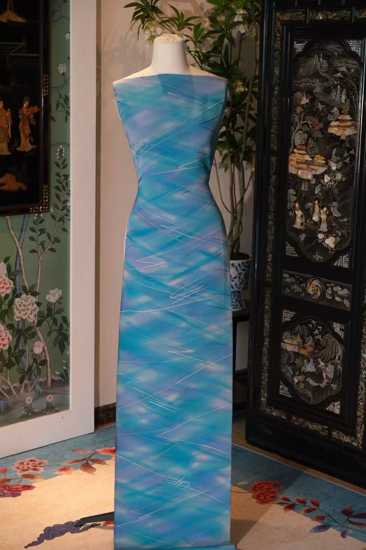 “碧海流光”是一款充满自然灵感和抽象艺术感的设计。面料底色以青色、湖蓝、浅蓝交织出如同水彩或云雾般变幻的渐变效果,捕捉了水天相接时的宁静与深邃。不规则的白色细线如同雨丝或光线在水面上的折射,为整体带来了动感和现代的摩登气质。这款布料特别适合打造飘逸、轻盈的款式,让穿着者散发出清新脱俗的艺术气息。