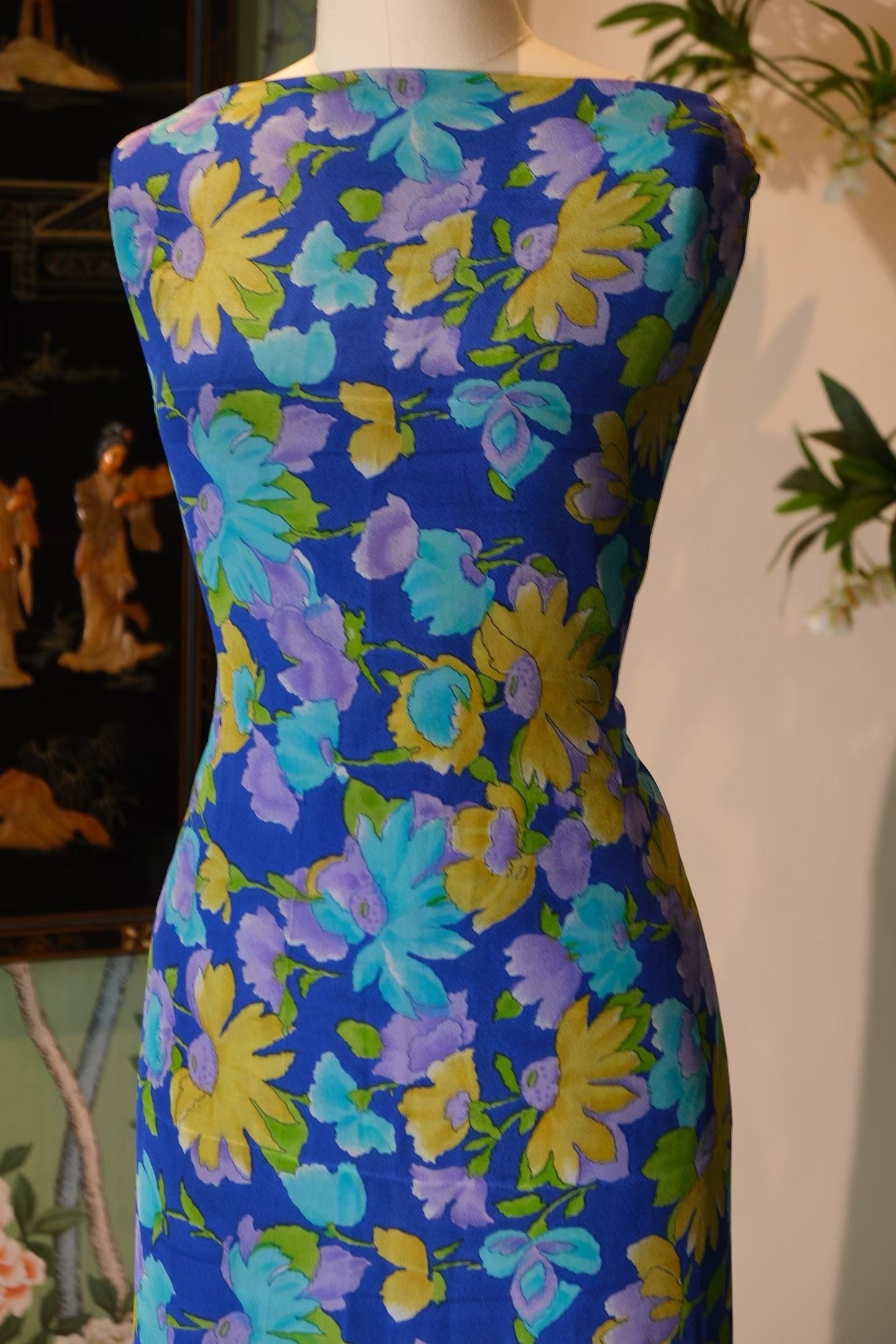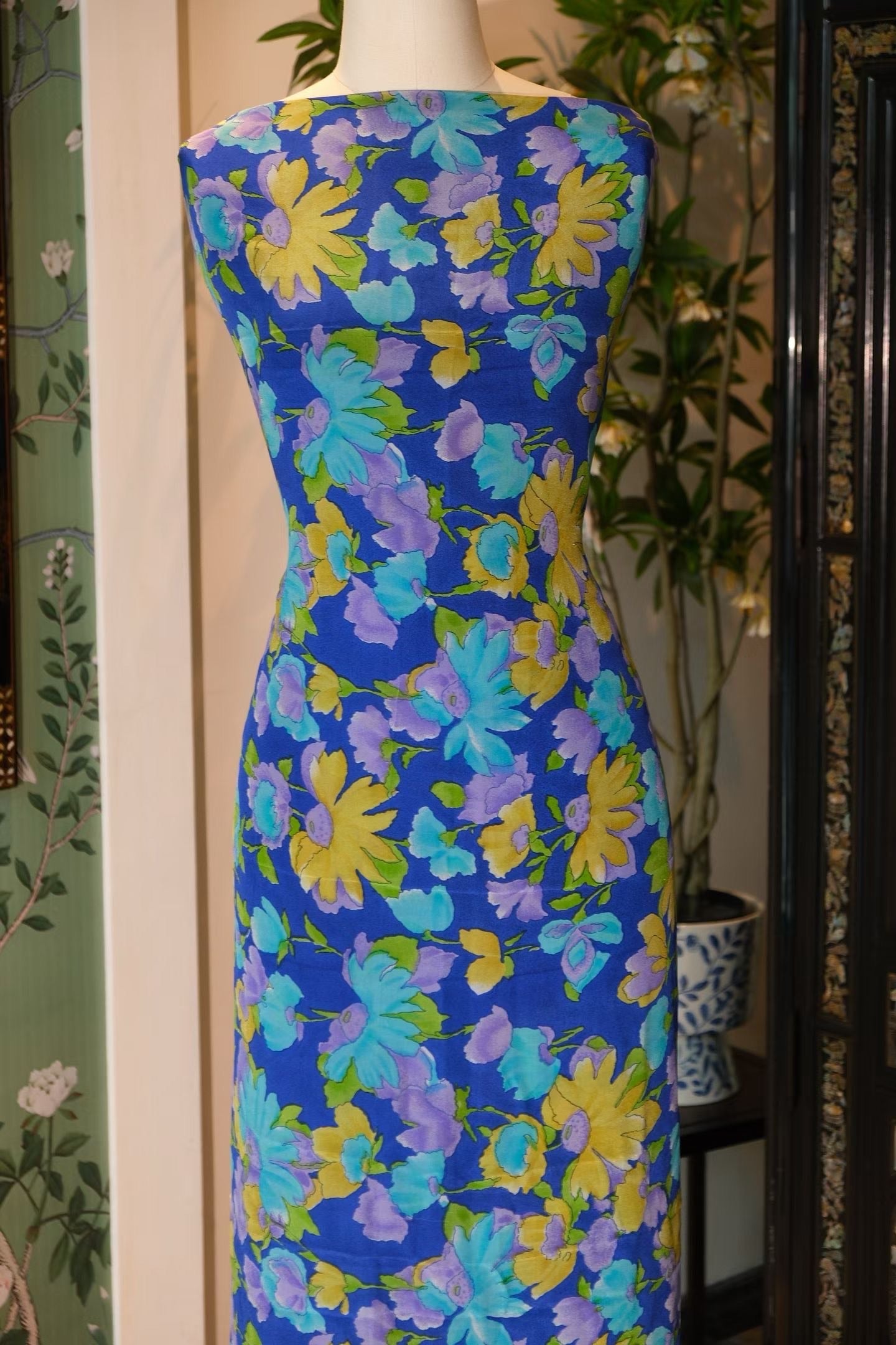 当钴蓝色的底色邂逅热烈的阳光黄、清新的湖水蓝和神秘的丁香紫,盛夏的序曲便由此奏响。这款面料,如同将整个仲夏的花园裁剪下来,凝聚了阳光的活力与夜晚的静谧。