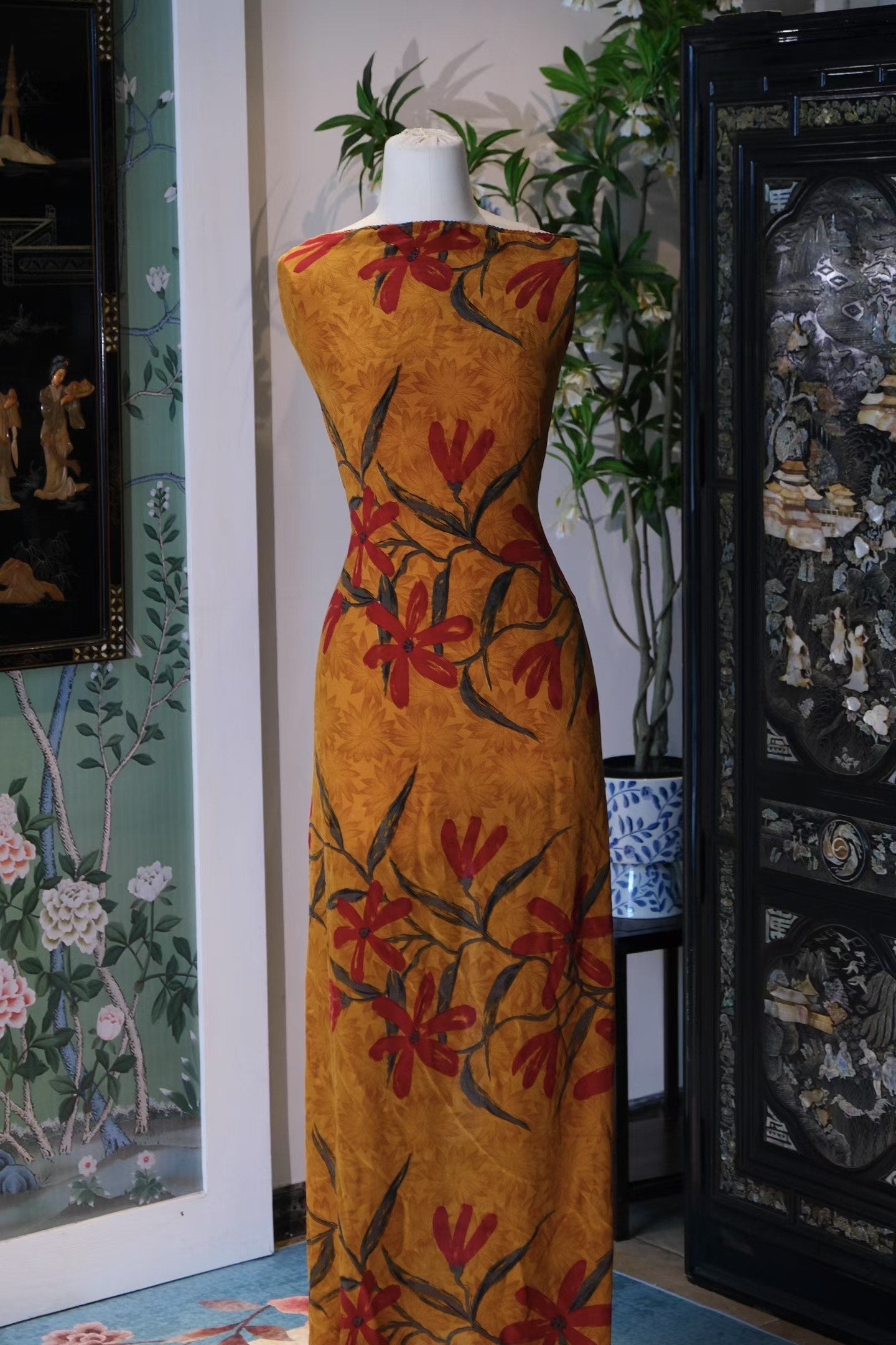 The overall design has an unconstrained, elegant style, with brushstrokes reminiscent of ink wash painting, merging classical Oriental subtlety with tropical exuberance. Its rich color layering and gentle sheen make it ideal for tailoring a long, refined Qipao, an ethnically inspired maxi dress, or a sophisticated jacket. Wearing it allows you to exude a unique passion and allure within the season's serene composure.
