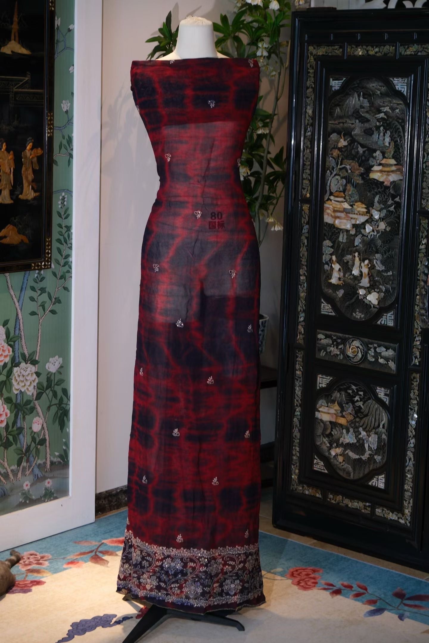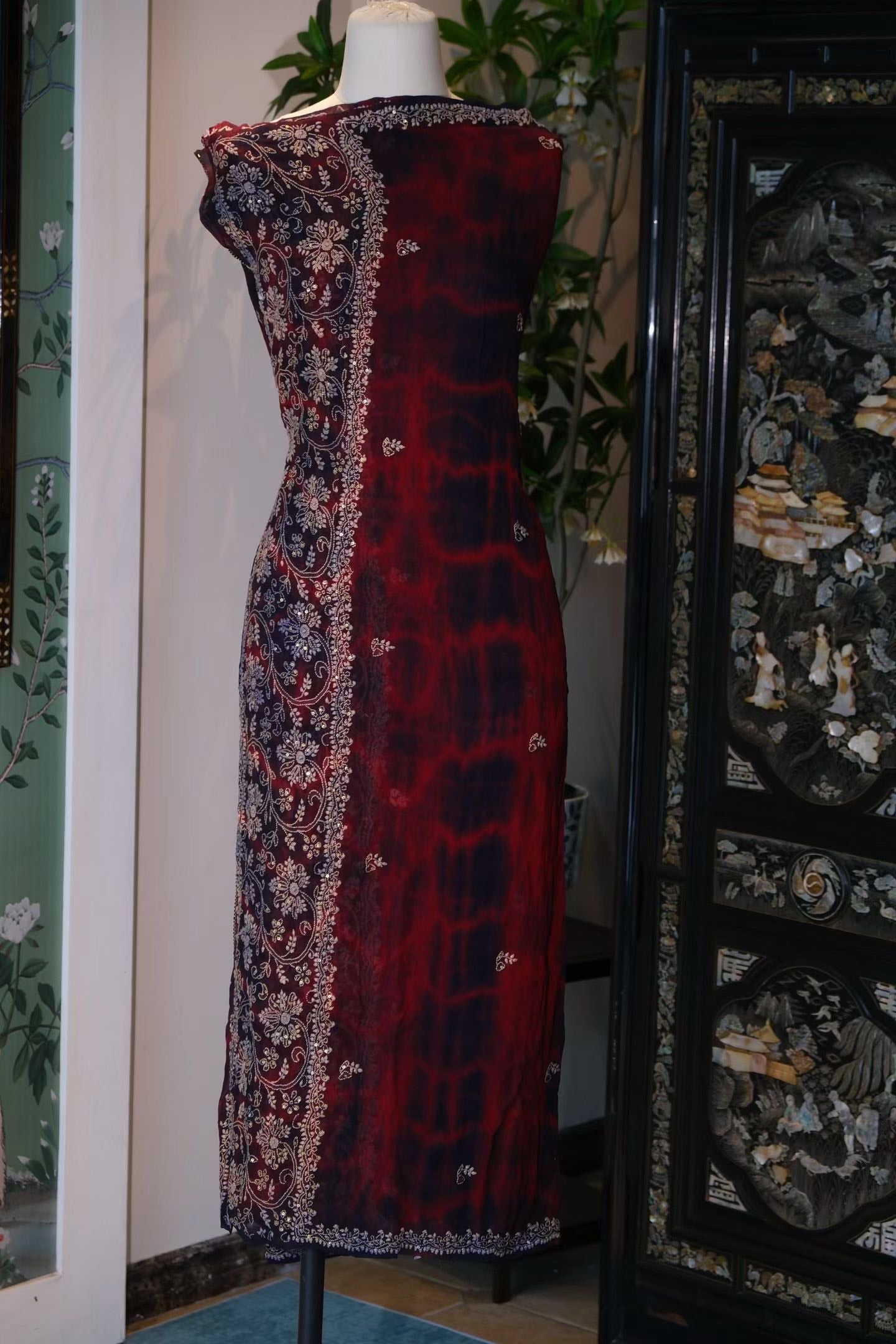主体部分以深邃的酒红与暗黑进行扎染或晕染,色彩碰撞出一种火焰般的迷人张力。在深沉的底色之上,稀疏的珠绣如同暗夜中闪烁的星辰,微光点点。最引人注目的是侧边和裙摆上那道浓郁的手工刺绣/珠绣花边,密布的繁复图案,充满了强烈的异域奢华风情。