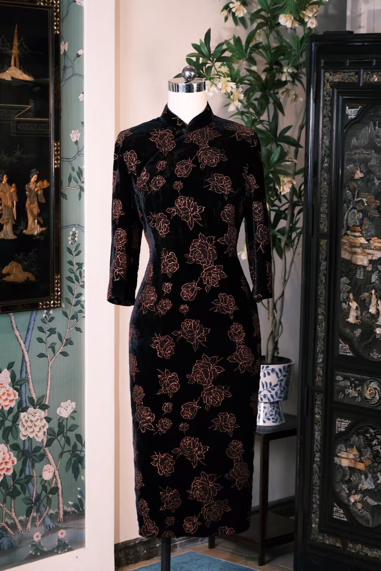 This particular piece, the 【Midnight Rose】Retro Black Velvet Copper-Gold Outlined Rose Pattern Three-Quarter Sleeve Long Qipao, is a luxurious garment designed for sophisticated evenings and grand occasions.
