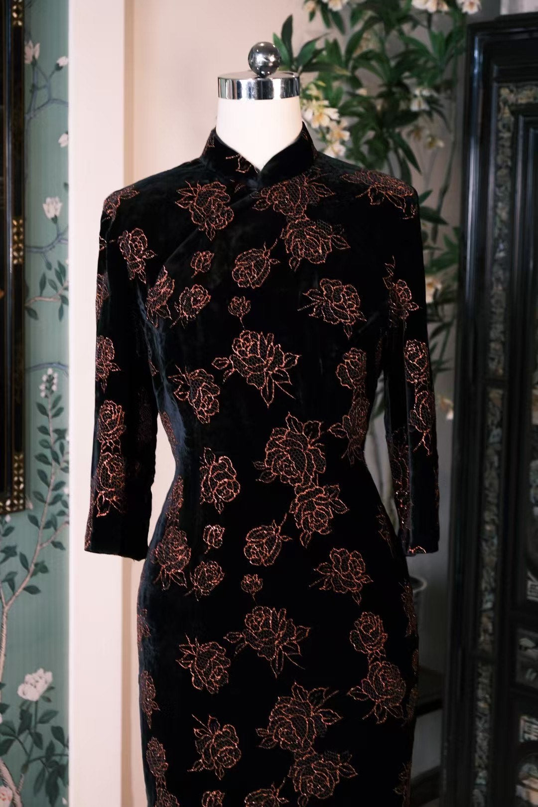 50年代 -【暗夜玫瑰】复古黑丝绒铜金手绘描边玫瑰图案七分袖长款旗袍 | 1950s -【Midnight Rose】Retro Black Velvet Copper-Gold Outlined Rose Pattern Three-Quarter Sleeve Long Qipao