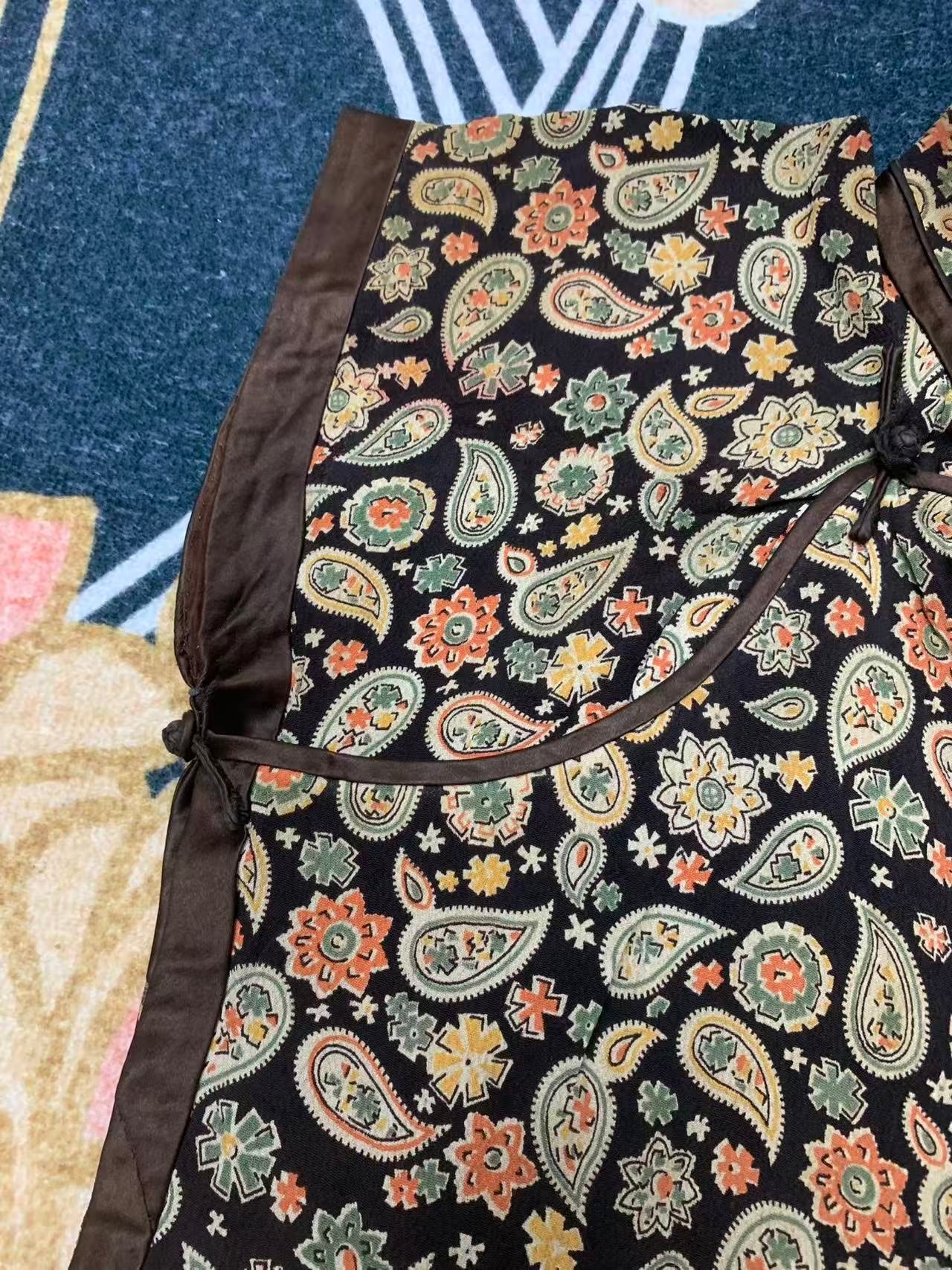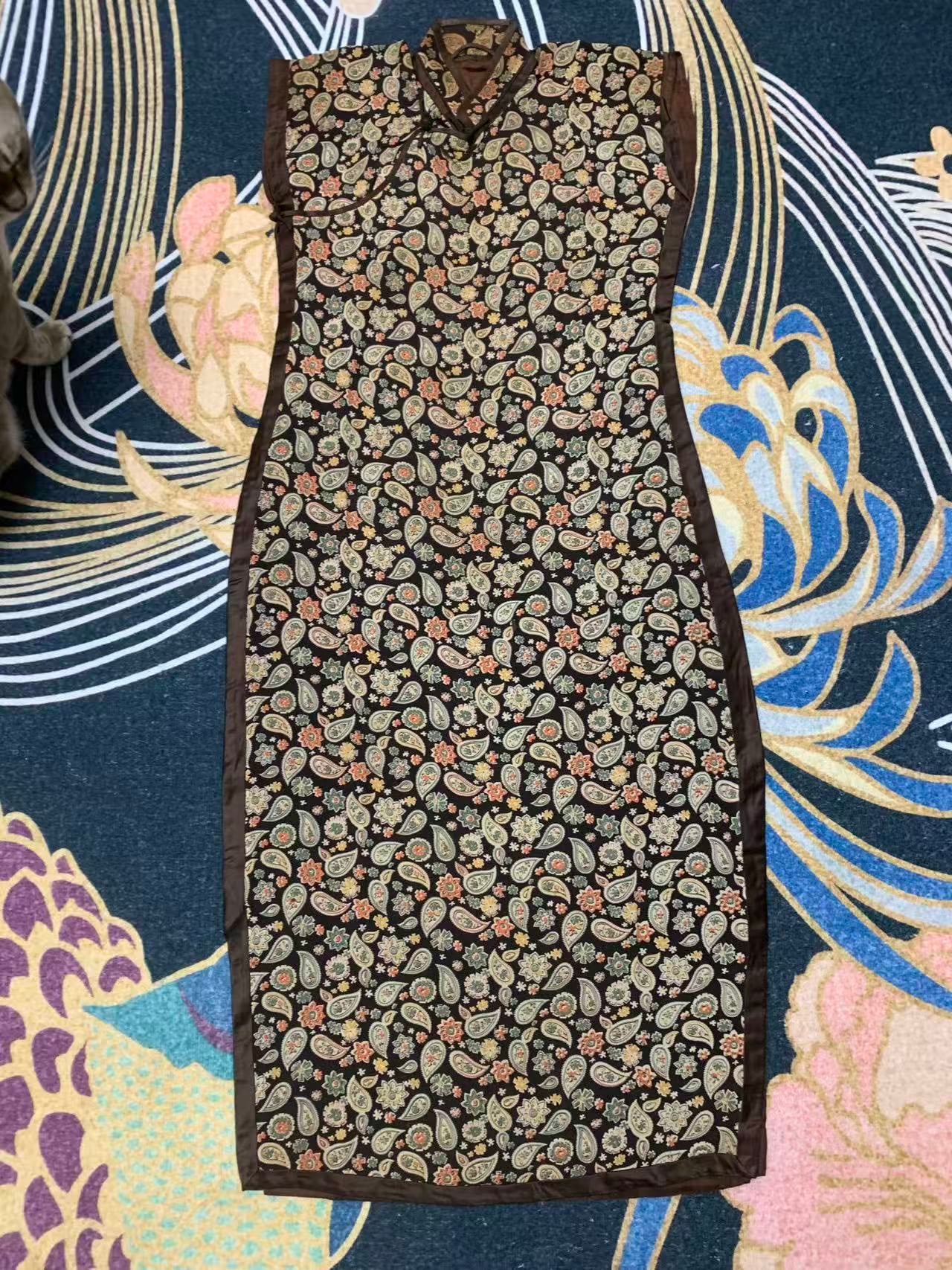 旗袍以深沉的黑色为底,其上铺满了雅致的佩斯利涡纹。这些水滴状、曲线柔美的花纹,由棕、红、米白等复古色彩勾勒而成,充满了神秘的异域风情和丰富的细节层次。
