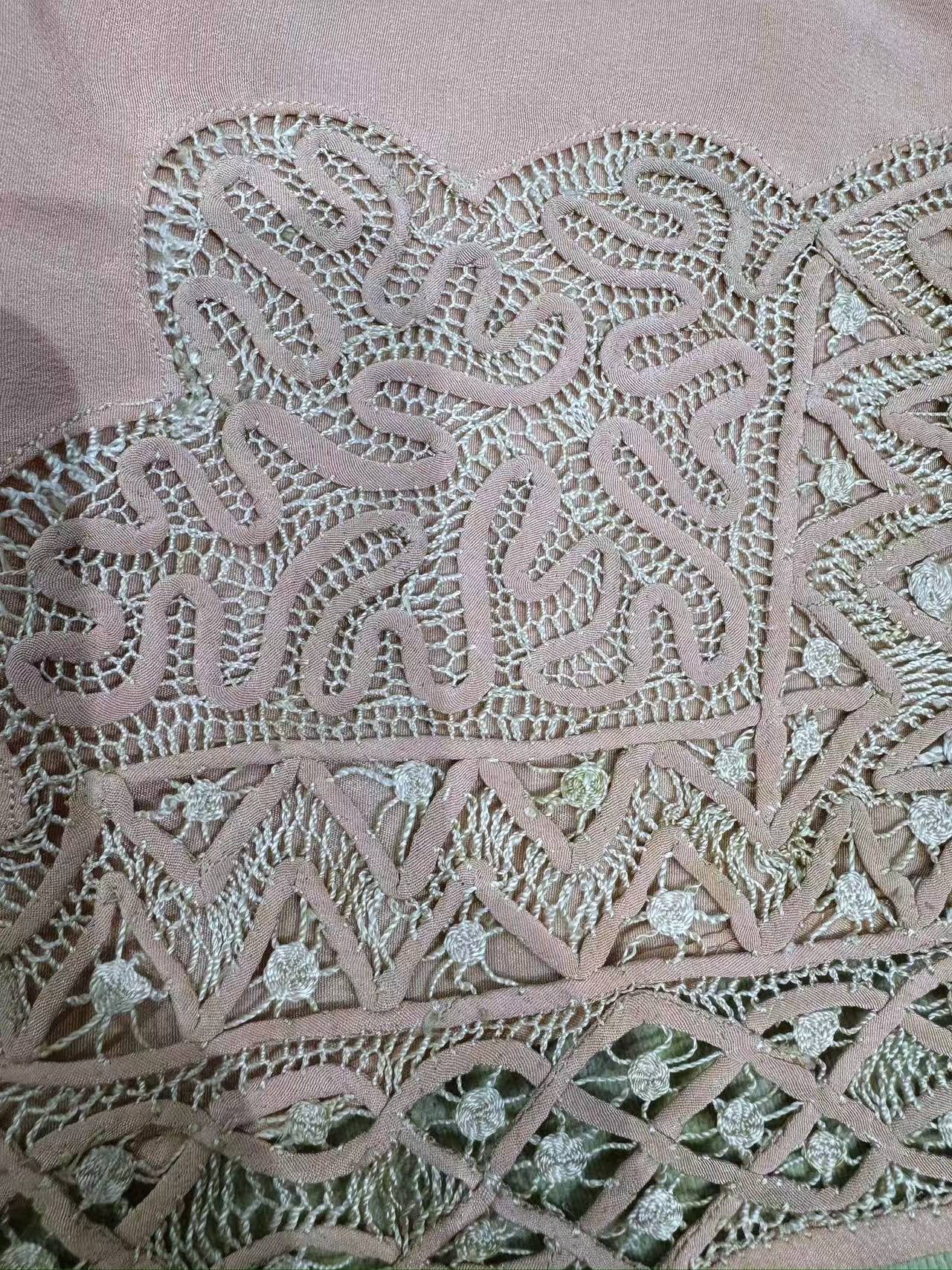 Rarity of Technique: The lace employs the "cutwork embroidery" technique, where openwork patterns are sketched with needle and thread upon the silk. It required embroiderers with decades of mastery to control the stitch density; the slightest error would ruin the entire pattern. This "ink-in-thread" craftsmanship was truly the "Haute Couture" of the Republican-era boudoir.