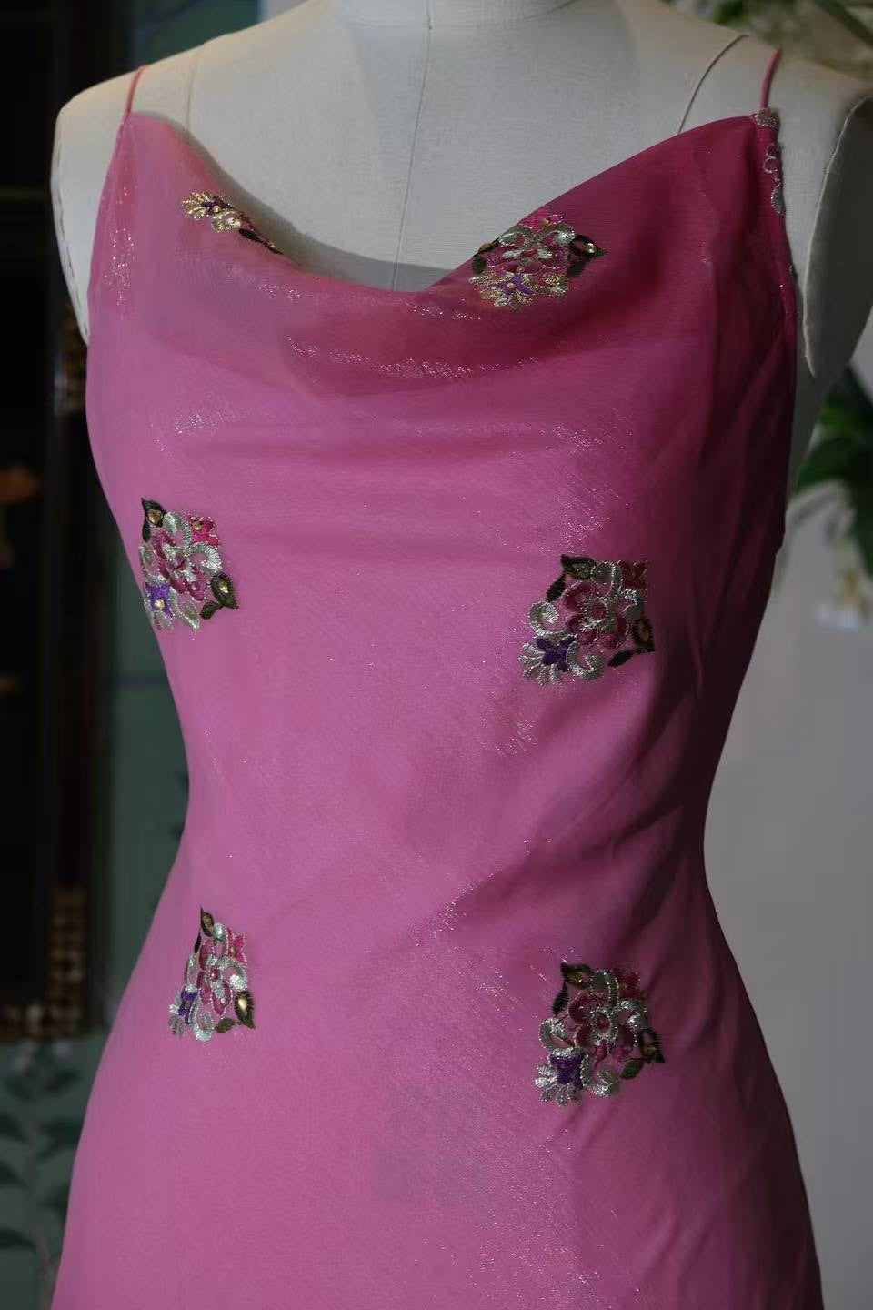 - Antique-Level Embroidery: The gilded floral motifs scattered across the bodice and hem replicate vintage 1930s couture patterns. Artisans have meticulously hand-embroidered each bloom using silver threads and colorful rhinestones. With a bas-relief texture, they refract light like precious gemstones.