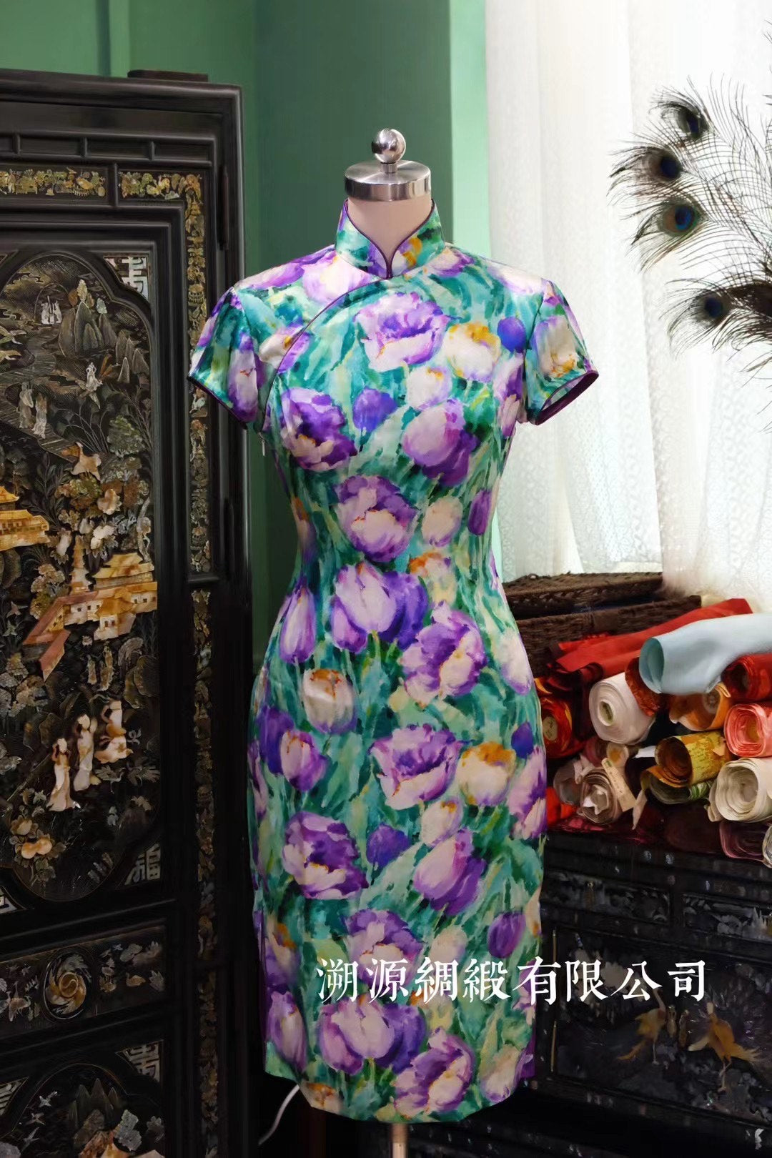 【Fabric and Pattern】 We have selected Fasac's high-end silk print oil-effect fabric, which lends the Qipao an unparalleled smooth luster and elegant drape. The limited edition tulip print on the fabric features rich colors and bold brushstrokes, creating an artistic effect akin to an original oil painting, exuding a luxurious and vibrant feel like a spring garden.