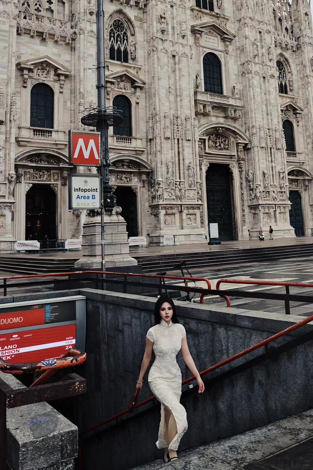步入米兰大教堂前的广场,每一刻都如画般定格。这款旗袍以其极致的奢华与独特设计,成为众人焦点。