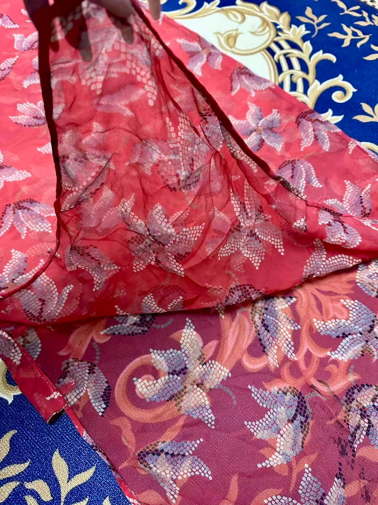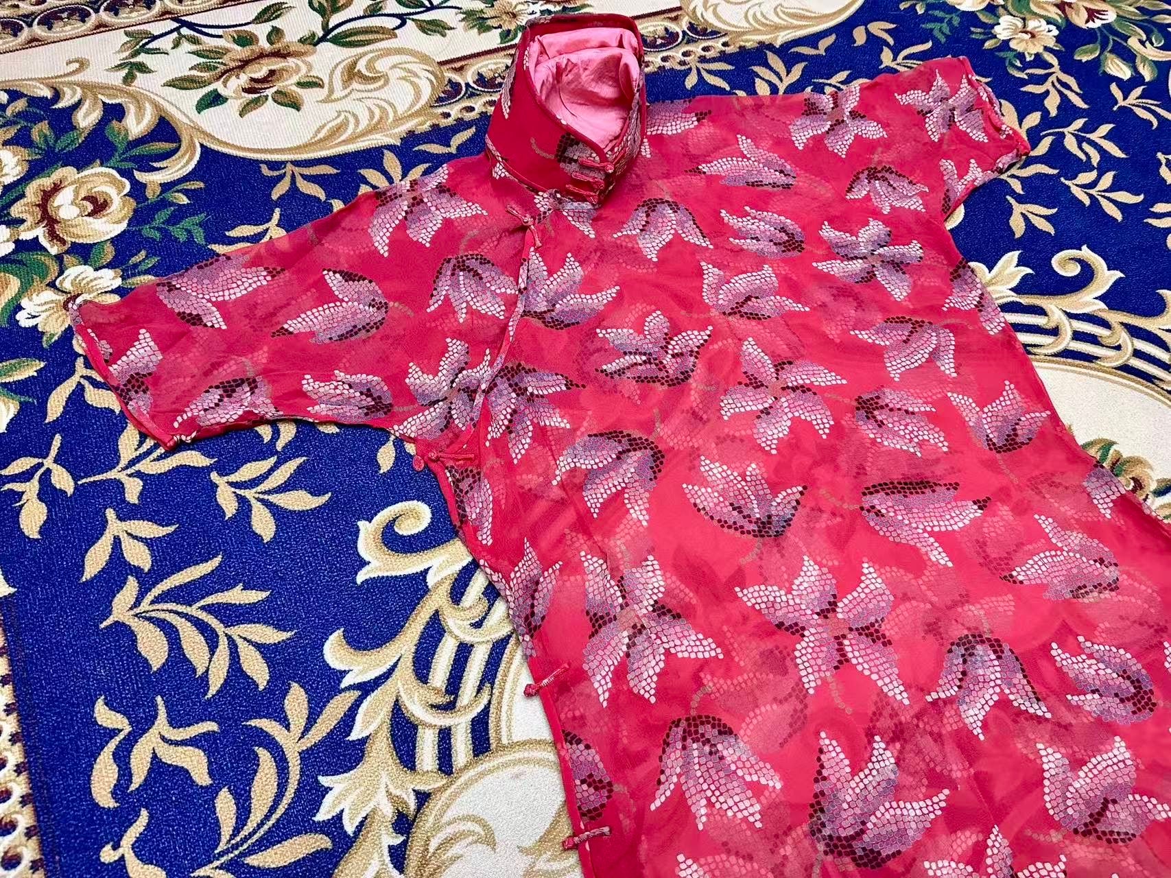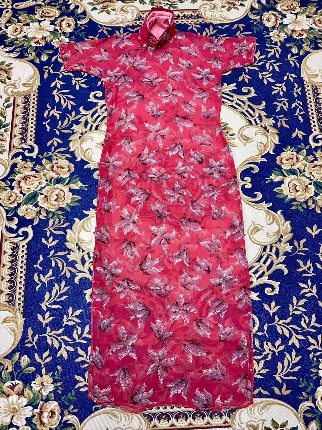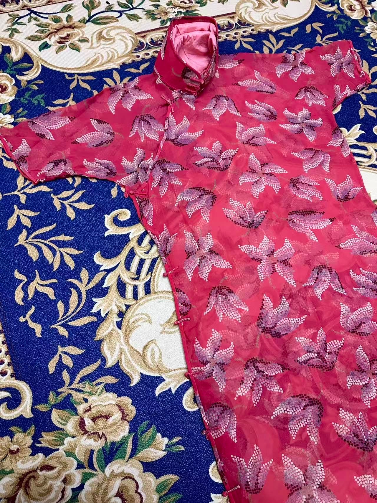 工艺上更显稀缺性:乔其纱的脆弱特性使其极难保存,而此件旗袍的印花清晰度、纱质完整性均属罕见。三十年代上海滩虽为远东时尚中心,但真丝乔其纱需进口,仅少数贵族仕女能享,更遑论以复杂套色工艺印制郁金香纹。张信哲收藏的同系列旗袍中,此件因完美呈现“透、薄、软”的纱质美学,成为研究海派服饰材料革新的关键实物。