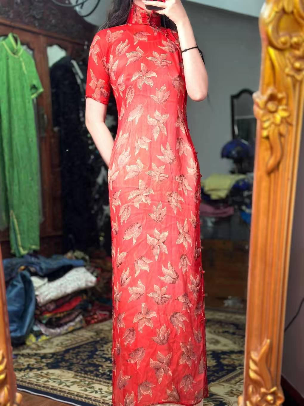 [I. Aesthetic Fusion: Art Deco Meets Oriental Curves] This masterpiece, hailing from a 1930s Shanghai atelier, utilizes Georgette chiffon as its canvas and tulip motifs as its soul. It flawlessly melds the geometric aesthetics of Art Deco with the undulating curves of the Oriental female silhouette. Crafted from Georgette gauze as light as a feather, the fabric flows like shifting mist under the light. With every step, the swaying hemline creates a hazy, poetic elegance—truly embodying the ethereal beauty of "viewing blossoms through a veil."