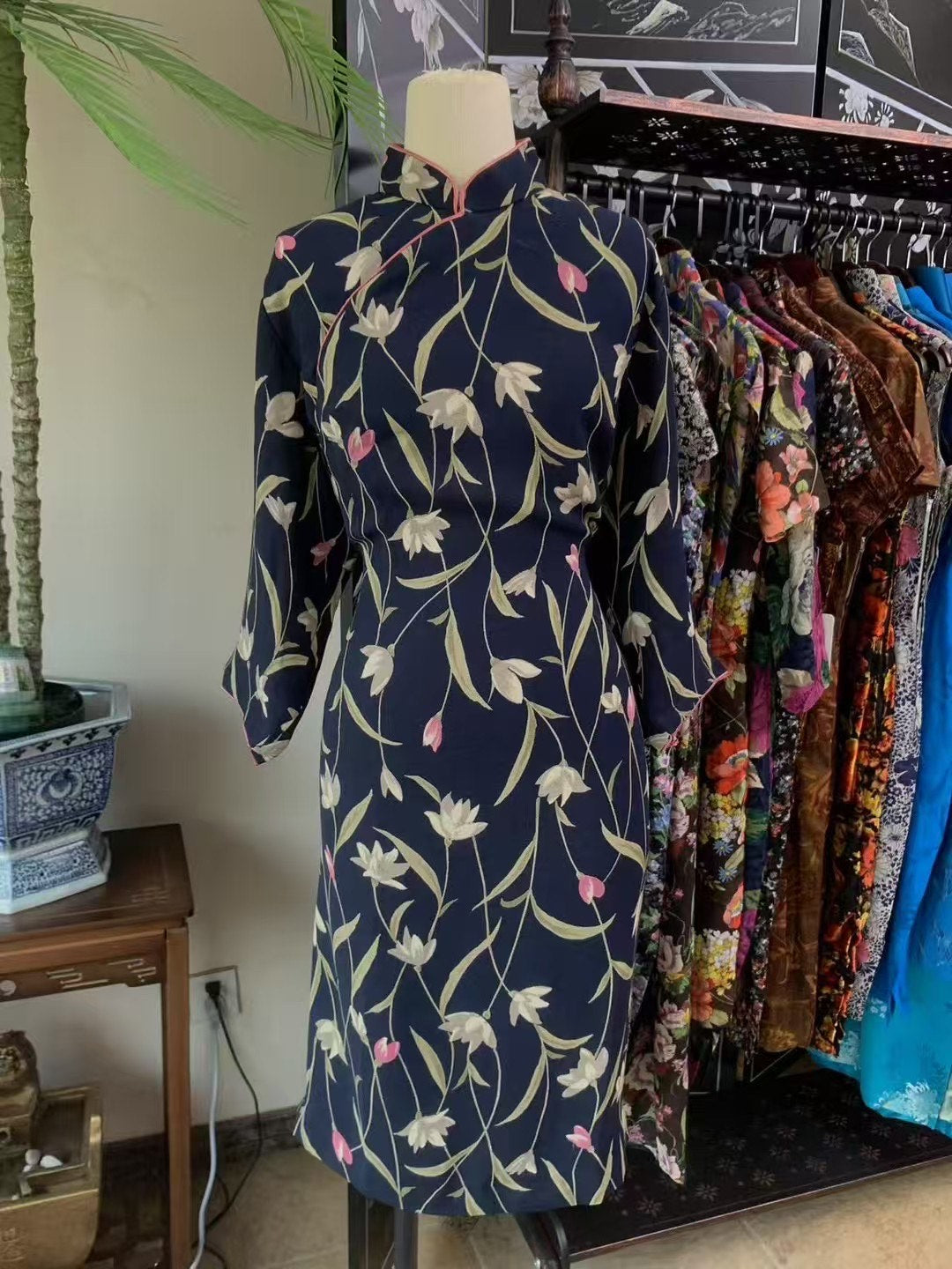 The second piece (referencing Qipao in images 2 & 3) is based on a deep midnight blue, delicately painted with elegant white and pale pink tulip-like flora. It is less intense, carrying a more serene quietude. The pink piping along the collar and diagonal closure is like a beauty mark on a lady's heart—subtle yet distinguished. This reserved elegance and faint fragrance perfectly embody the spirit of "a flower near yet far away," seemingly whispering a secret, timeless tale.
