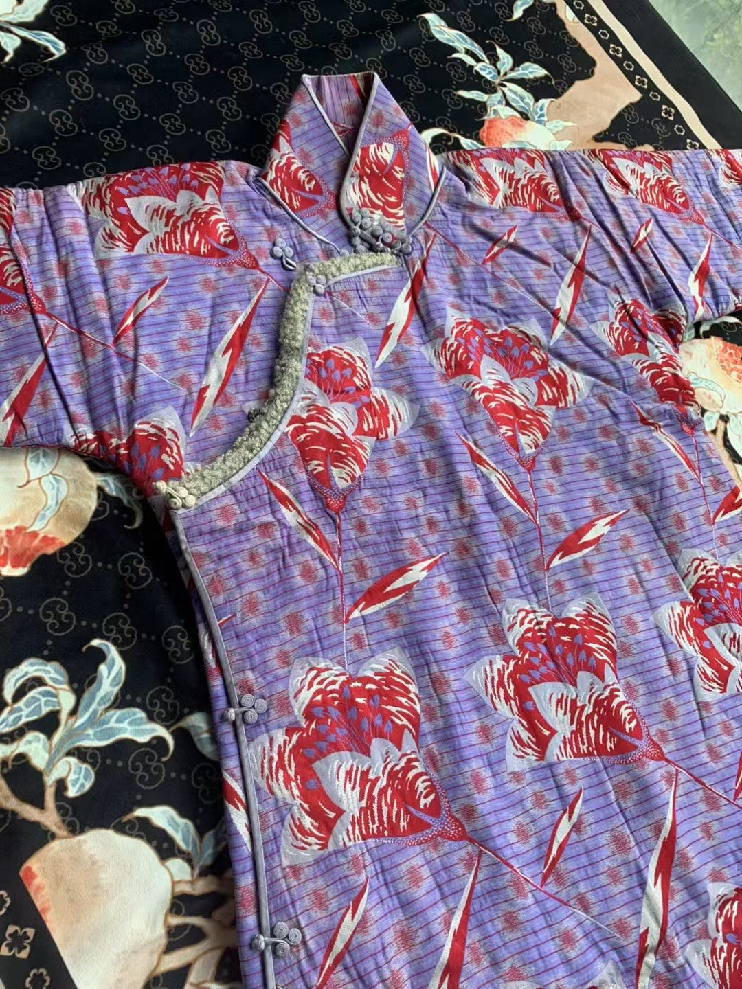 整件旗袍以稀有的浅薰衣草紫色为底,其上是交错的细密点状图案和纵向条纹,构成一个迷幻的背景。主印花是热烈奔放的朱红色几何感花朵,花叶以凌厉的Art Deco线条呈现,与底色的柔美形成强烈而戏剧性的碰撞,散发出一种复古又前卫的独特魅力。