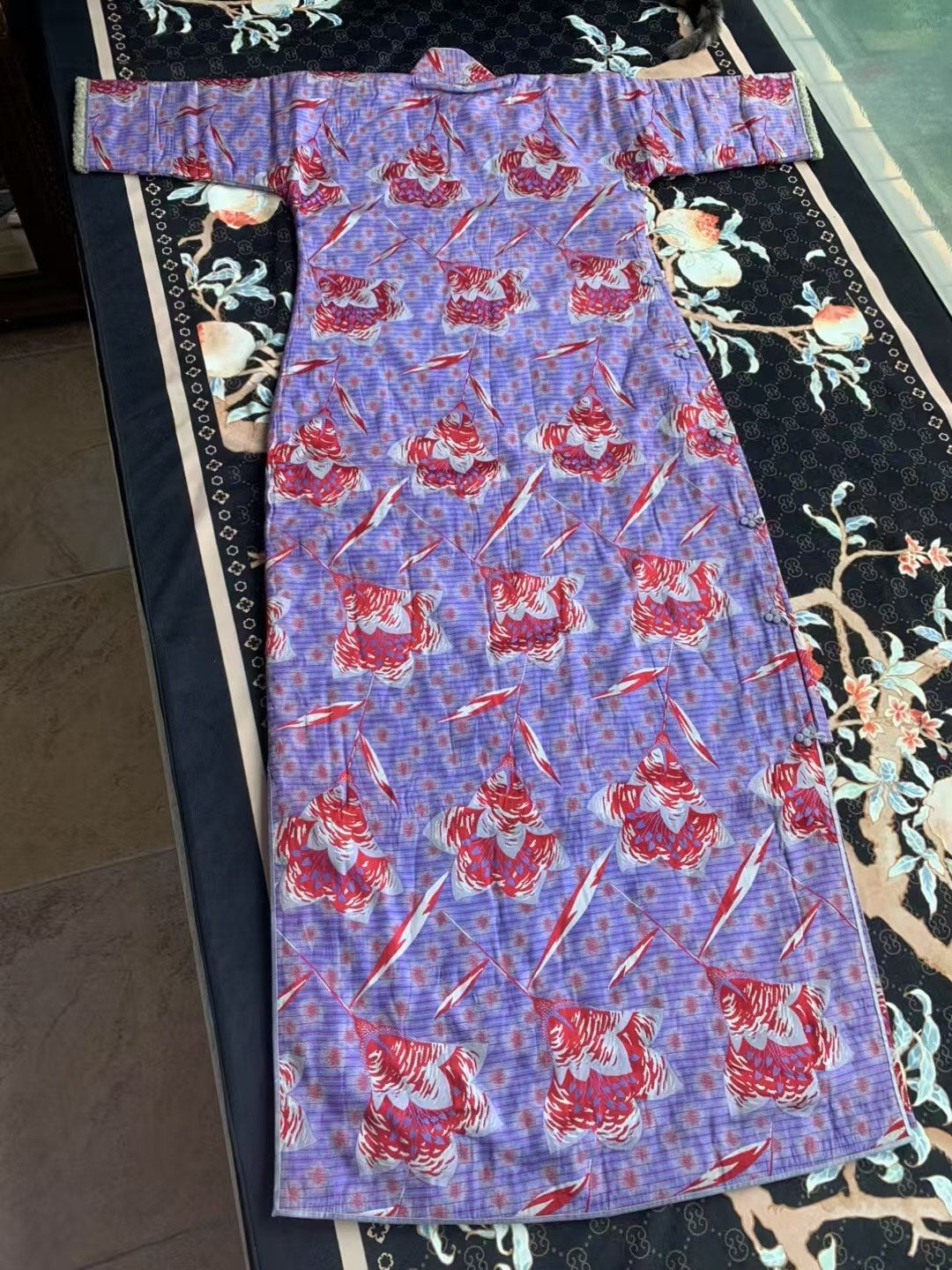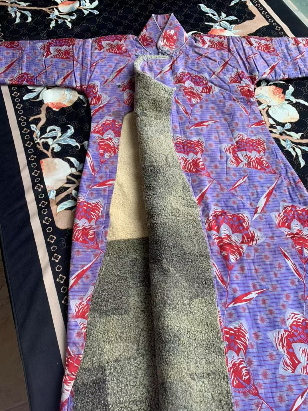 这款古董曳地旗袍的版型极为隆重,拖地的长度营造出旧时名媛的优雅气场。内衬可见厚实的羊羔毛衬里,使其兼具旗袍的韵味与长外套的保暖实用性,是为冬季贵族社交场合而制。衣襟和领口处采用精致的同色系滚边和盘扣,细节处尽显年代感与手工的温度。