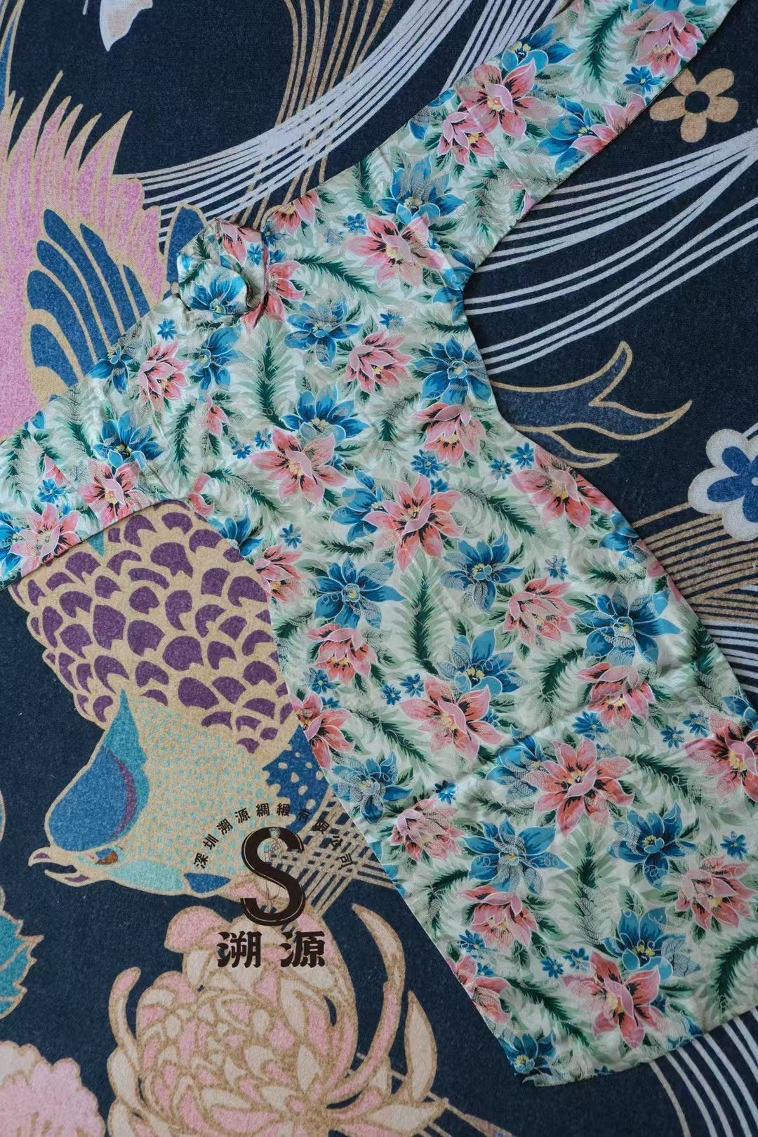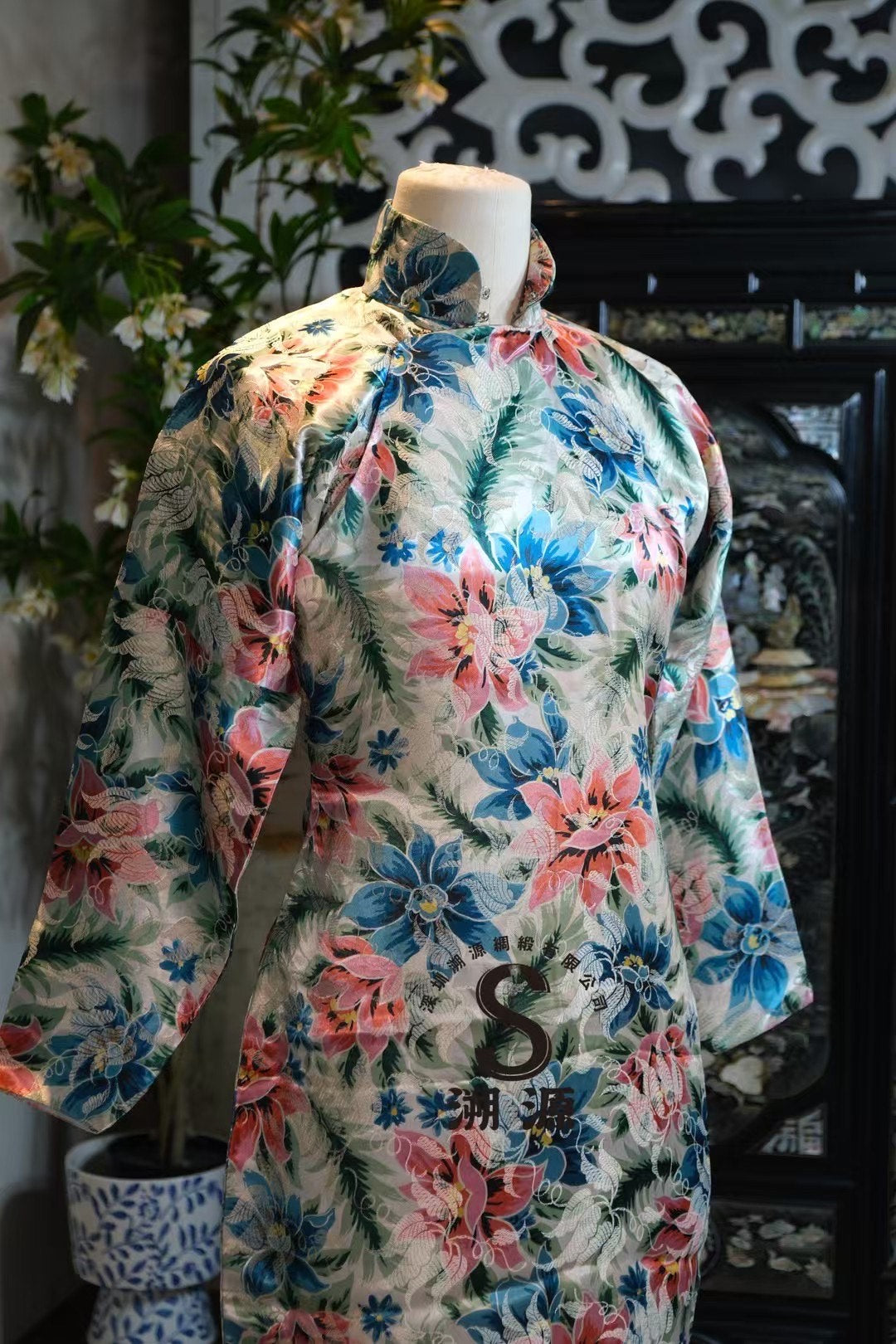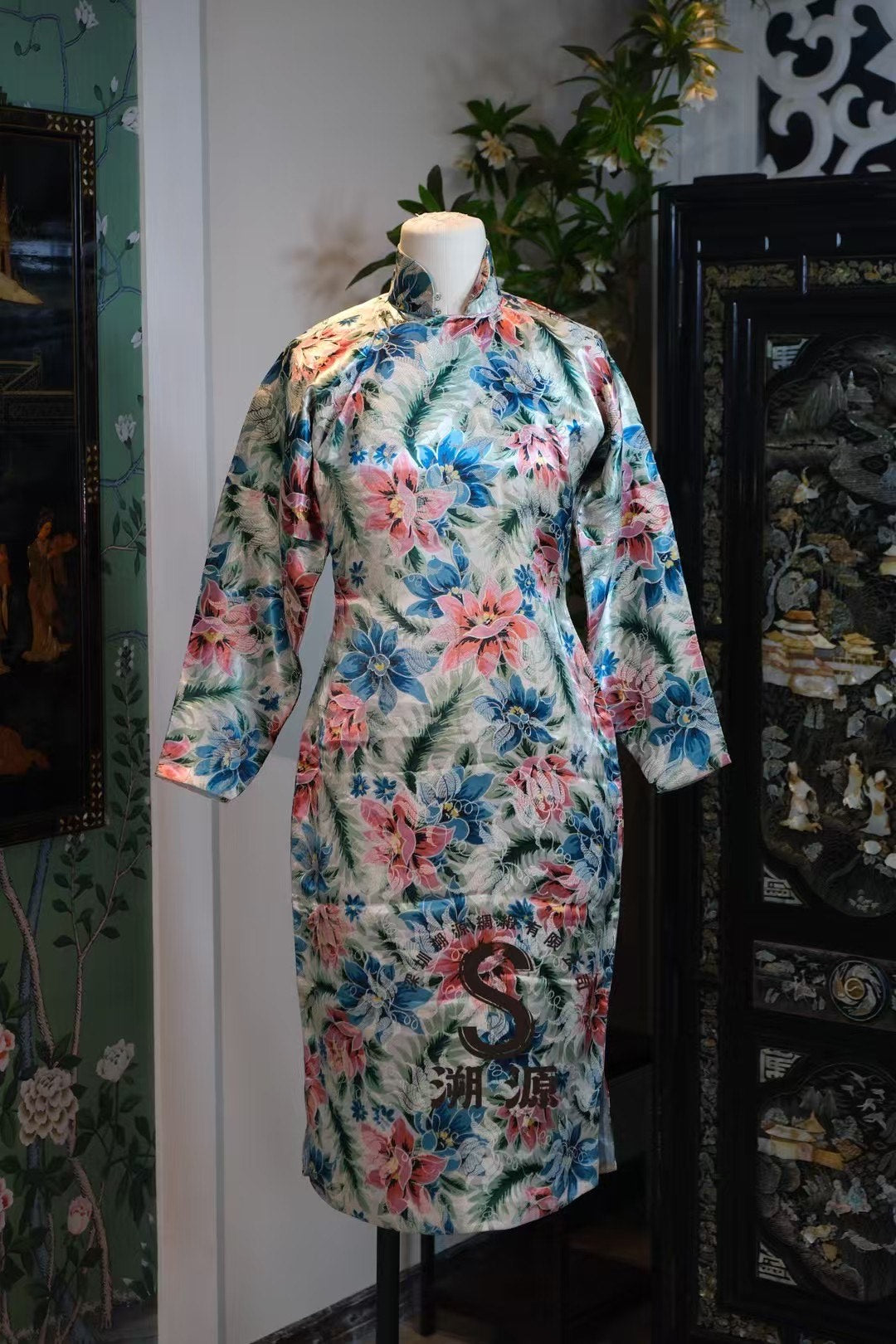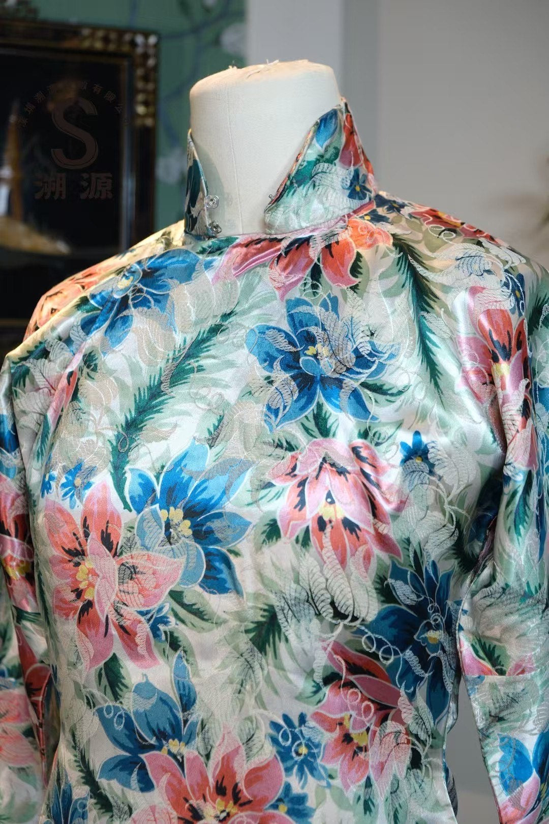一袭旗袍,跨越近一个世纪的时光,将民国四十年代的优雅风华尽数收纳。这件月白地粉蓝花卉真丝长袖旗袍,以其独特的光泽和细腻的触感,诉说着旧时闺秀的含蓄与情深。