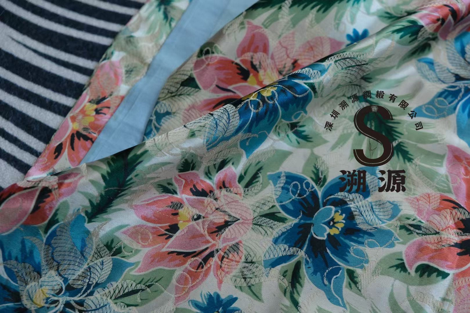 柔和的月白真丝为底色,如一匹轻盈的绡光流云,其上繁复的提花工艺,将盛开的粉色与蓝色花卉勾勒得栩栩如生。那粉蓝花影舞春风般的图案,热烈而不失温婉,仿佛将春日园林中最烂漫的景致绣在了衣襟之上。