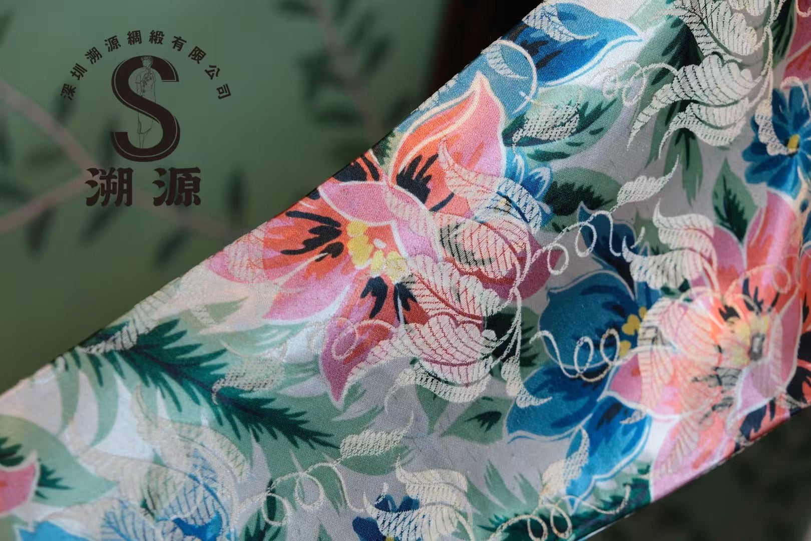 The soft moonlight white silk serves as the base, like a piece of light, shimmering cloud. Upon it, the intricate jacquard weaving outlines vibrant pink and blue blossoms with lifelike detail. The pattern, like floral shadows dancing in the spring breeze (粉蓝花影舞春风), is passionate yet gentle, as if the most enchanting scene from a spring garden has been embroidered onto the fabric.